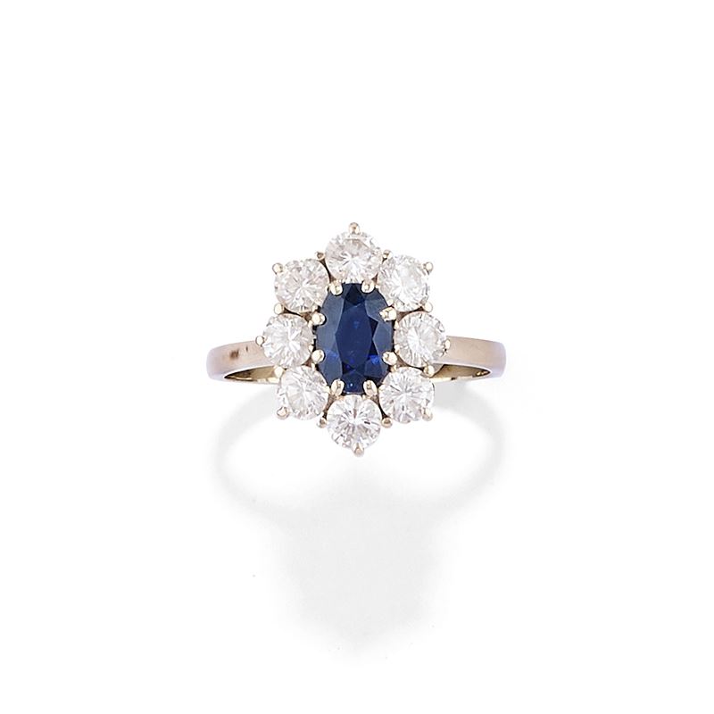 in oro bianco 18kal centro zaffiro taglio ovale e contorno in diamanti taglio brillante per totale ct 0,80 circa.