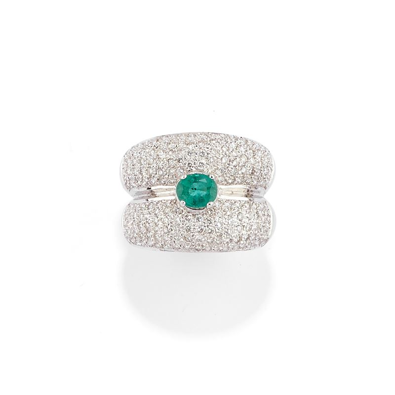 al centro smeraldo taglio ovale, ai lati due fasce in diamanti taglio brillante per totale ct 1,60 circa.