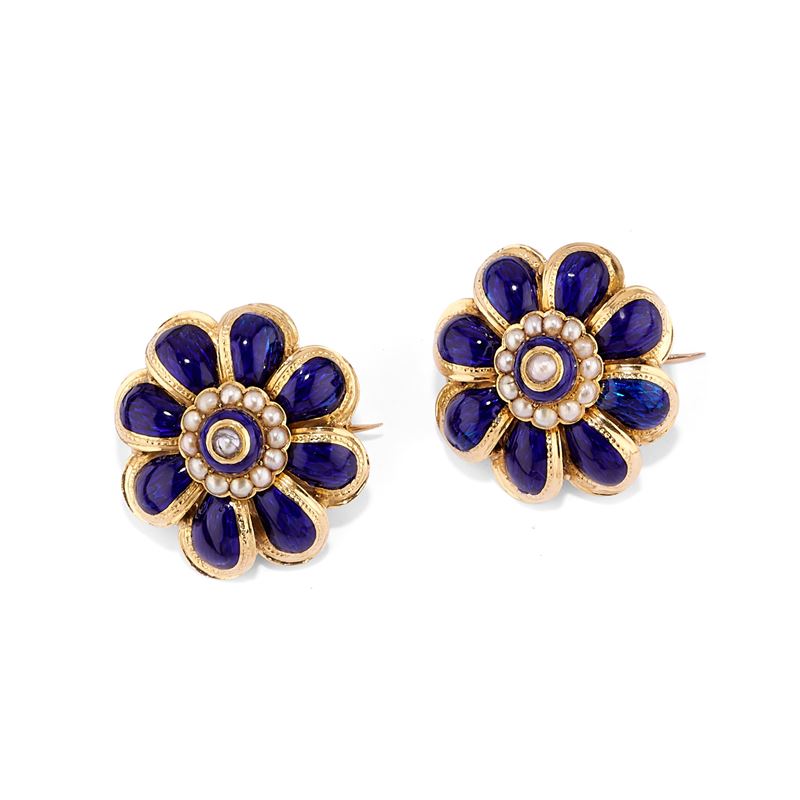 in oro giallo 18ka forma di fiore con decoro in smalto blu e microperle.