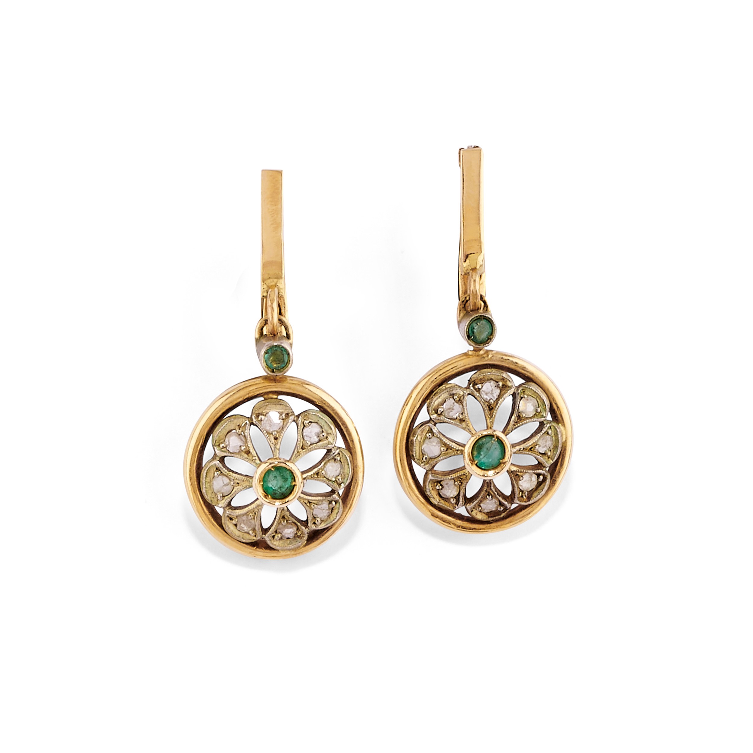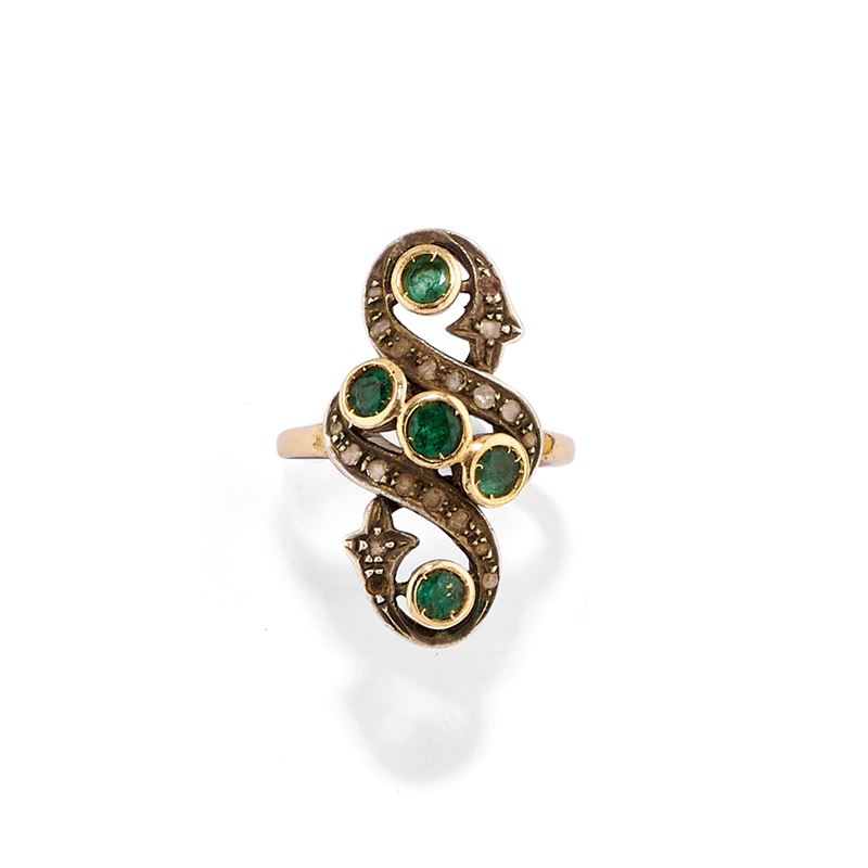 in argento e oro giallo 12krealizzata con diamanti taglio rosa e smeraldi taglio rotondo, composta da anello e coppia di orecchini con chiusura perno e clip.