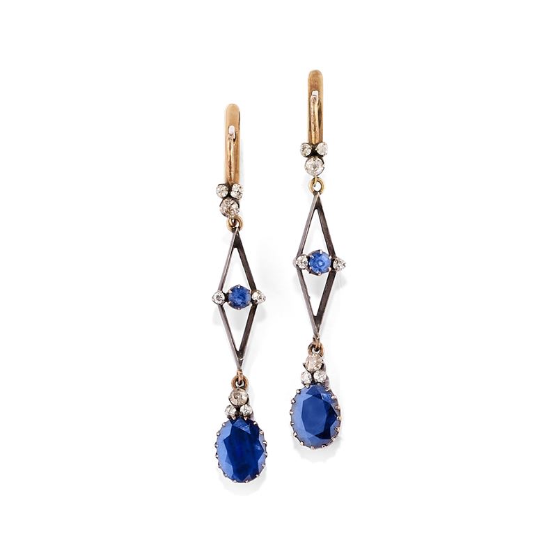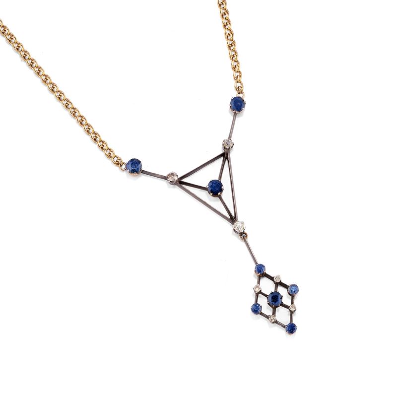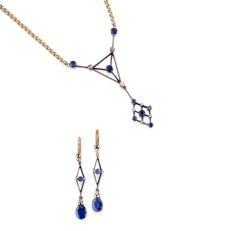 in argento e oro giallo 14ka motivi geometrici con diamanti taglio vecchio e brillante, zaffiri taglio rotondo e ovale per totale ct 5,00 circa, composta da collana e coppia di orecchini con chiusura perno e clip.