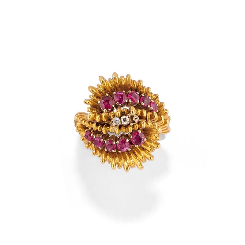 in oro giallo 18kuno a contrarié con rubini taglio rotondo e diamanti taglio huit-huit, l'altro con rubini taglio rotondo e smalto policromo, difetti.