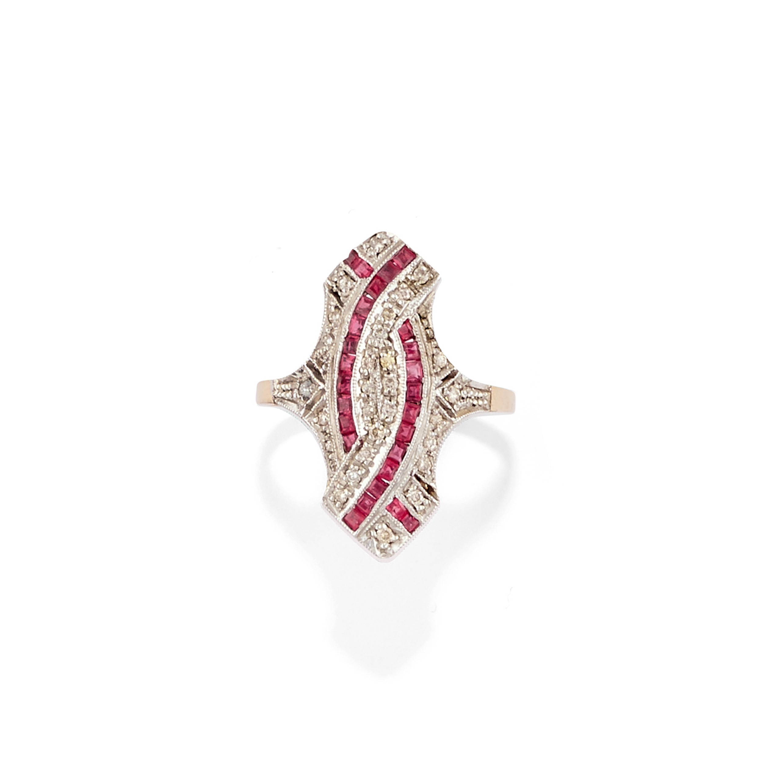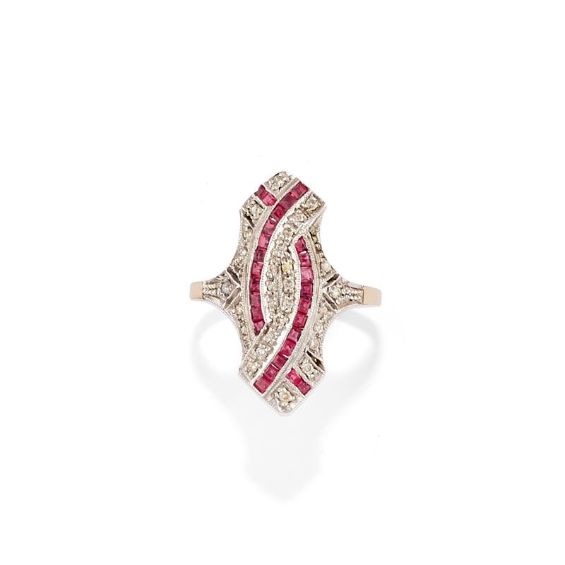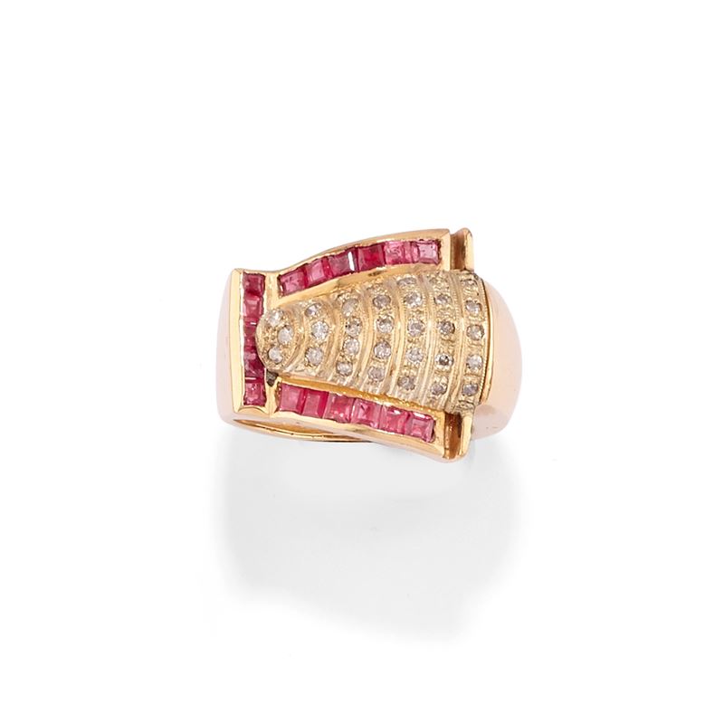 in oro giallo bassa caratura e argentoimpreziositi da diamanti taglio rosa e brillante, rubini sintetici taglio carré.