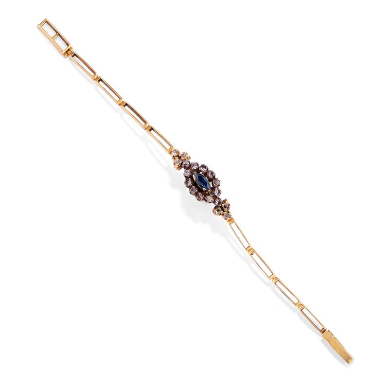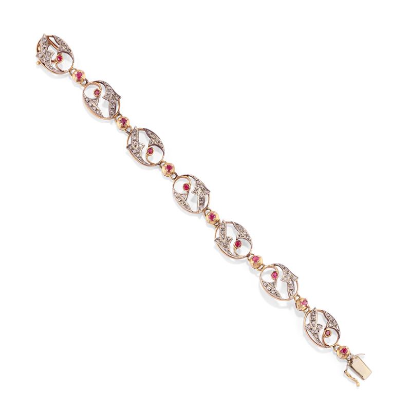 in oro bicolore 12k e argentouno con zaffiro taglio marquise e diamanti taglio rosa, l'altro con rubini taglio rotondo e diamanti taglio rosa.