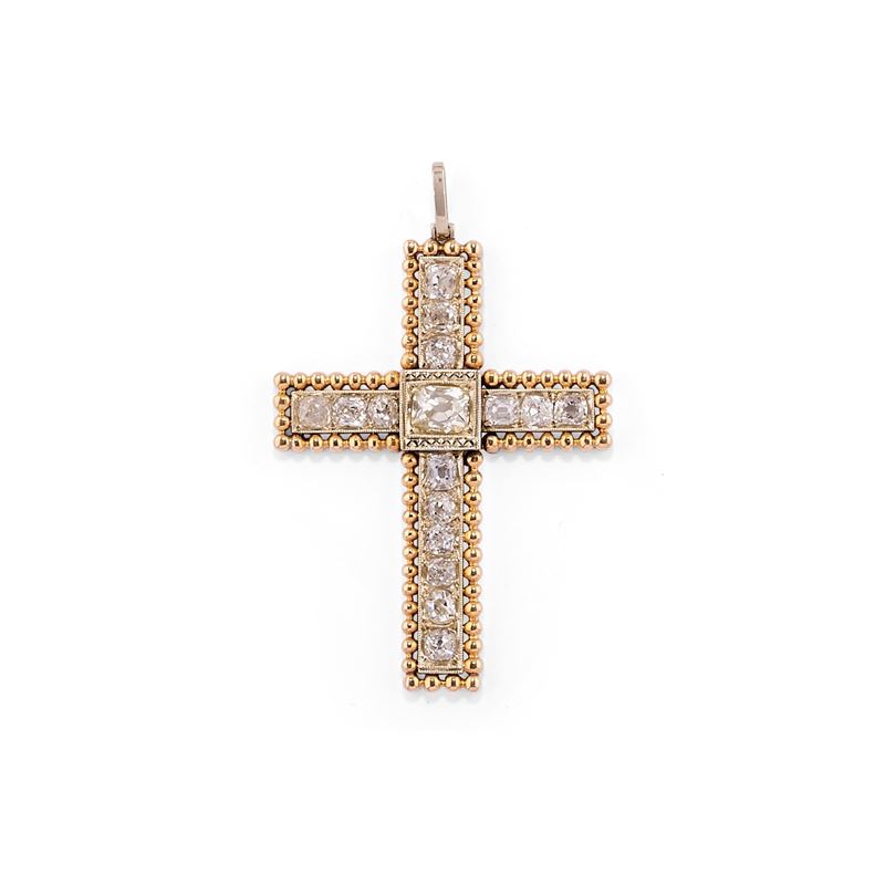 in oro giallo 18k e platinouno a croce con diamanti taglio vecchio per totale ct 1,50 circa, l'altro a scudo con diamanti taglio vecchio e rosa.