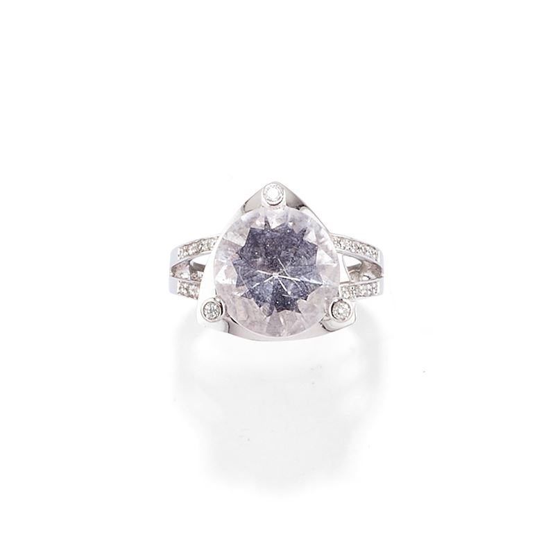 in oro bianco 18kal centro quarzo taglio rotondo e contorno in diamanti taglio brillante.
