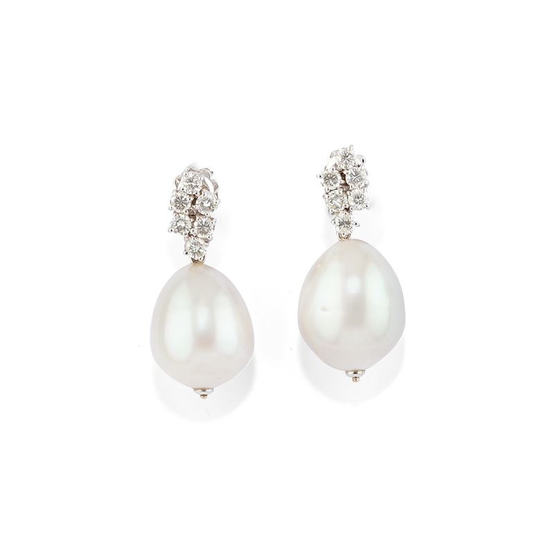 in oro bianco 18ka due file di diamanti taglio brillante per totale ct 1,00 circa, da cui diparte perla coltivata di mm 16,00 circa.