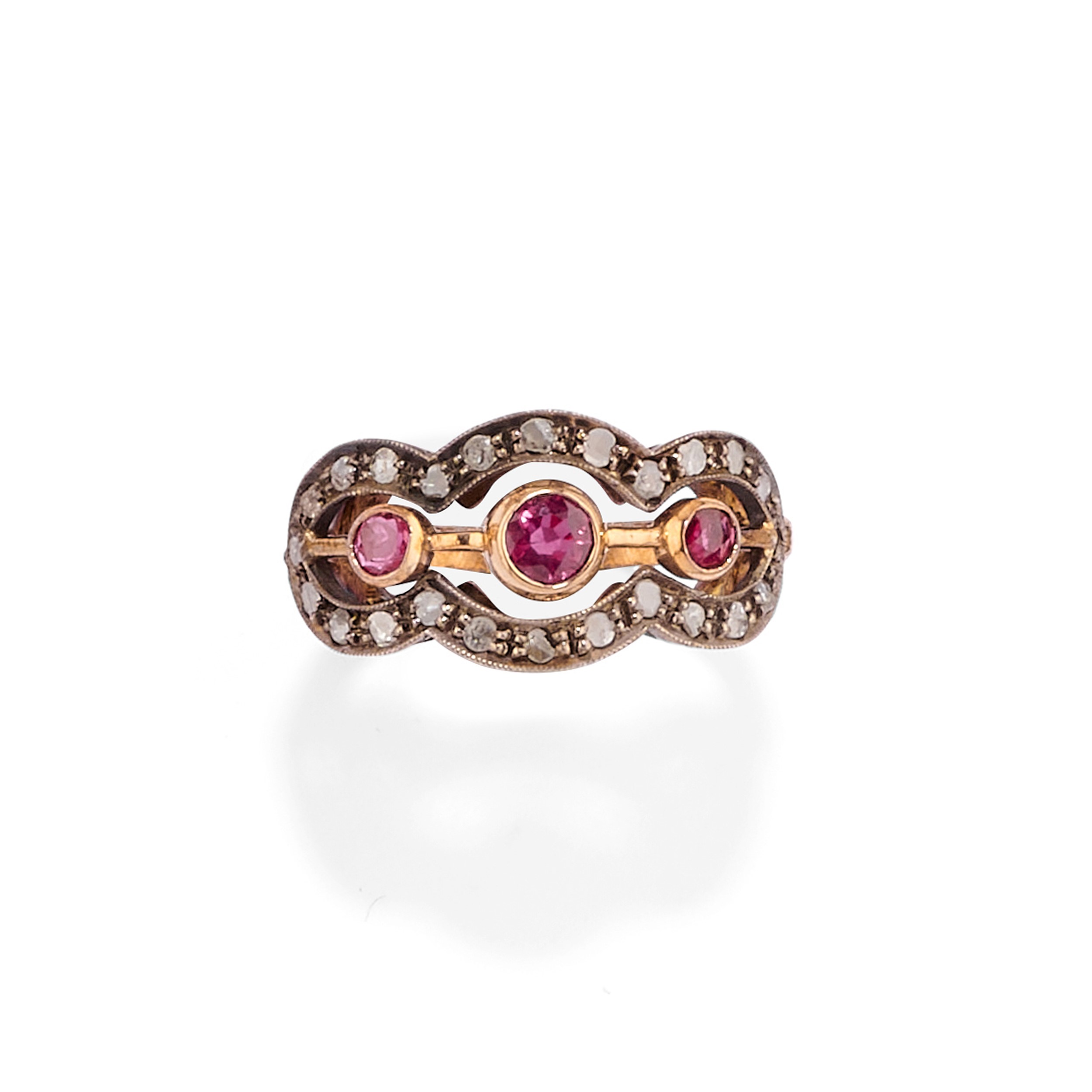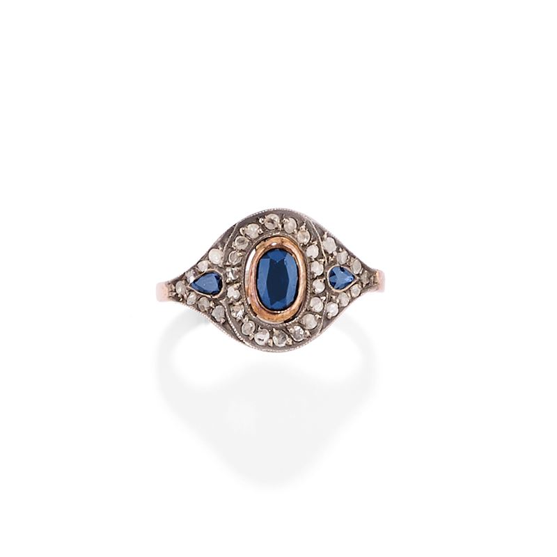 in oro giallo bassa caratura e argentoimpreziositi da zaffiri, rubini, smeraldi e diamanti taglio rosa.