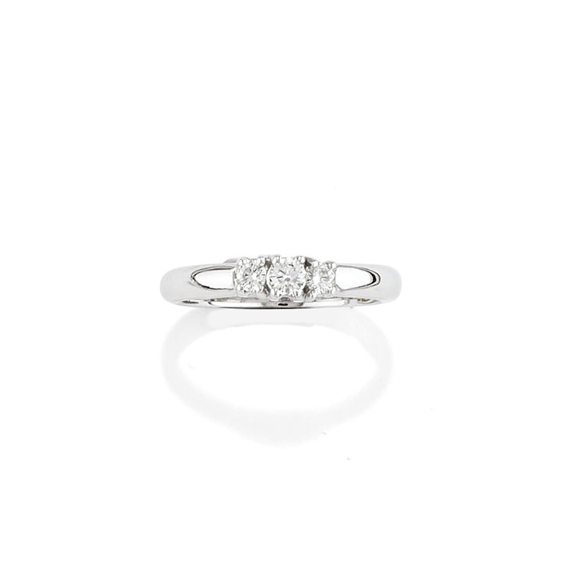 in oro bianco 18kal centro tre diamanti taglio brillante per totale ct 0,20 circa.