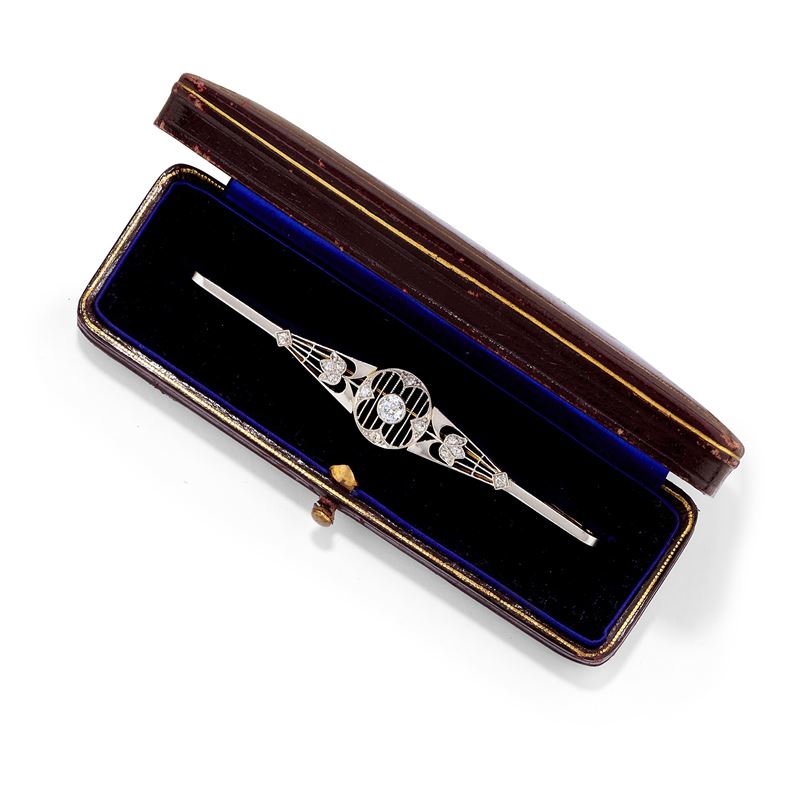 a barretta con diamanti taglio vecchio per totale ct 0,50 circa, con astuccio.
