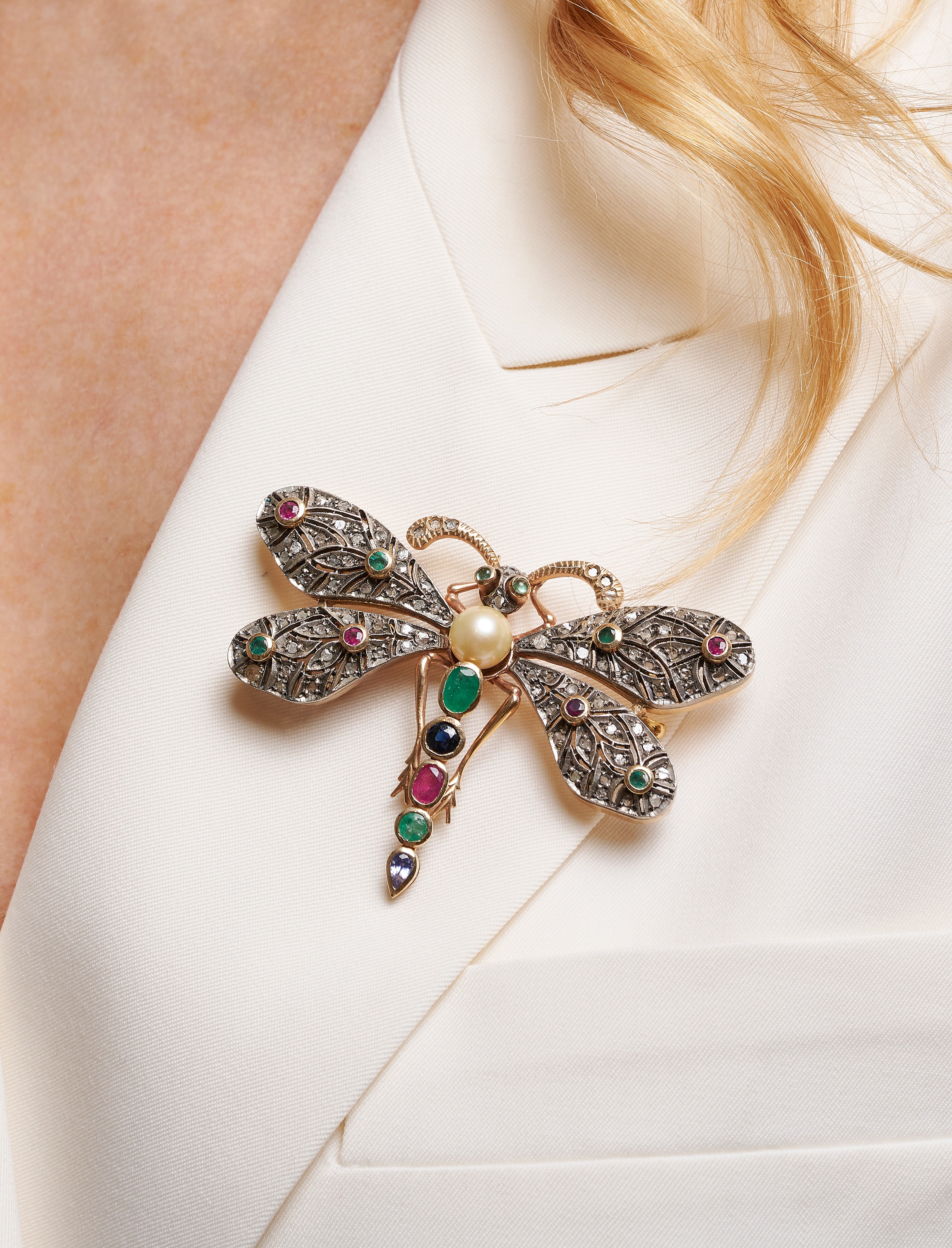 in oro giallo bassa caratura e argentodecorata da zaffiro, rubini, smeraldi, pietra azzurra, perla coltivata e diamanti taglio rosa.