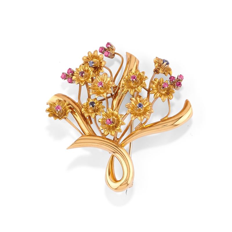 in oro giallo 18ka bouquet di fiori en tremblant con zaffiri e rubini.