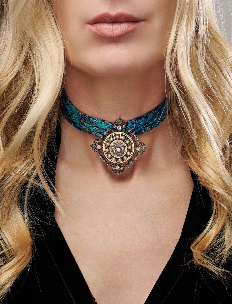 in oro bicolore 18ka rosone con microperle e diamanti taglio brillante e rosa.