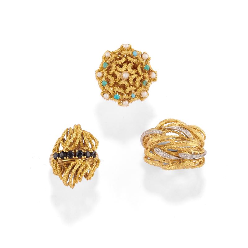 uno con turchesi e microperle, uno con diamanti e uno con zaffiri.