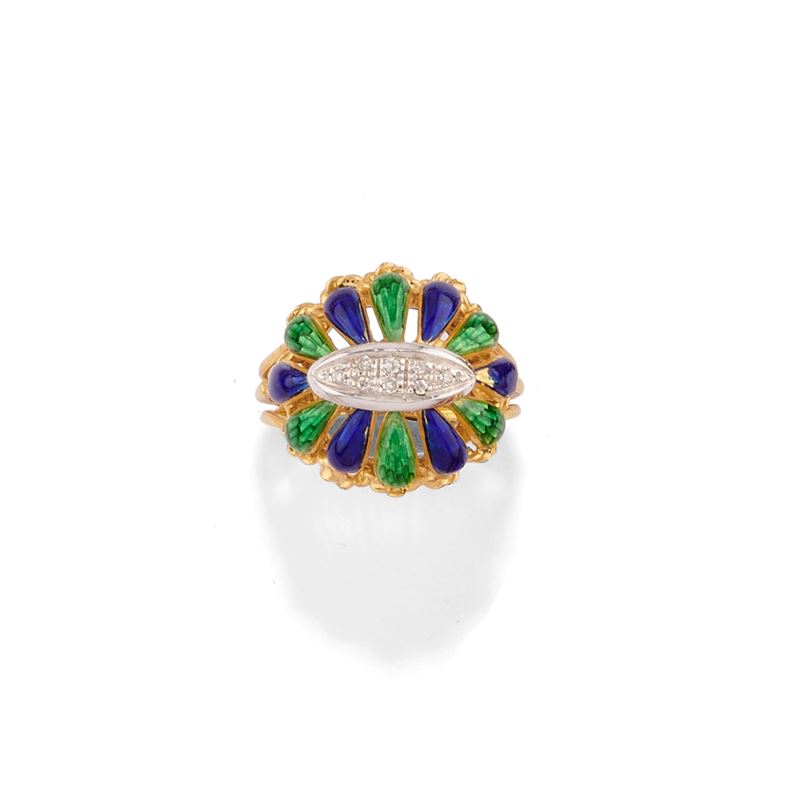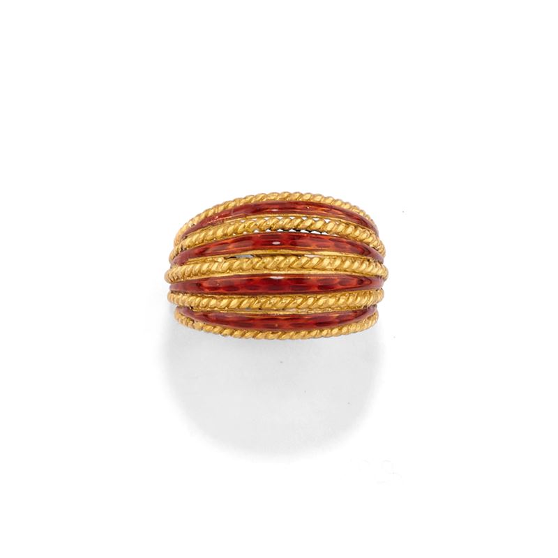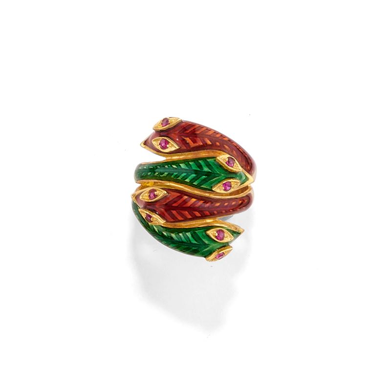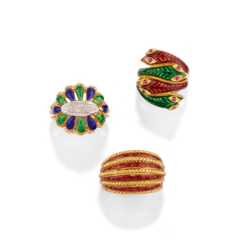 in oro bicolore 18kuno costolato, uno con teste di serpente e uno a cupola, decorati da smalti policromi, piccoli diamanti e pietre rosse, difetti.
