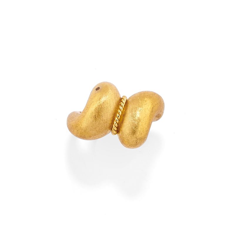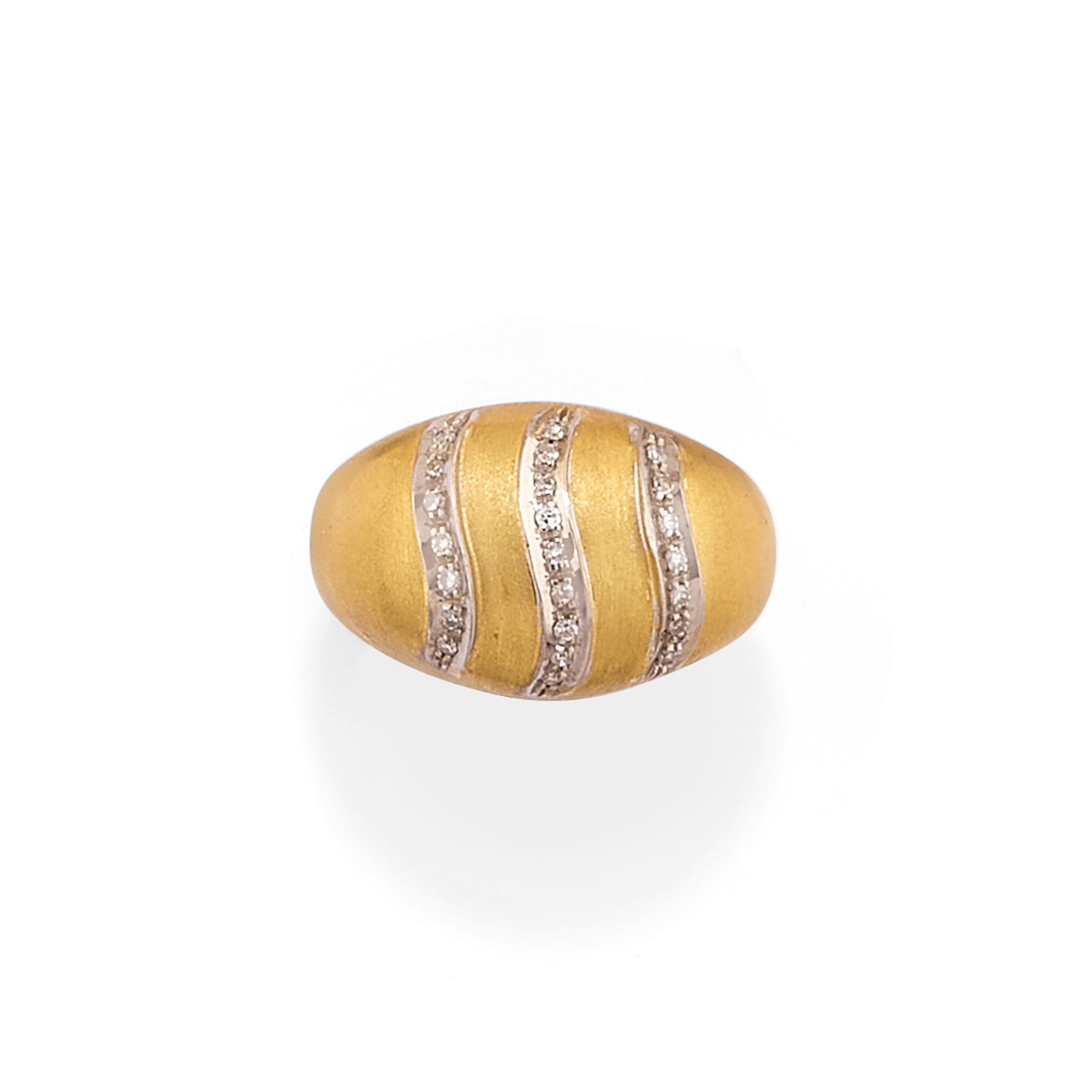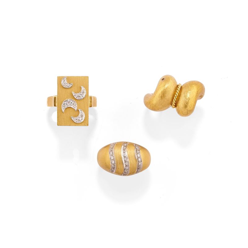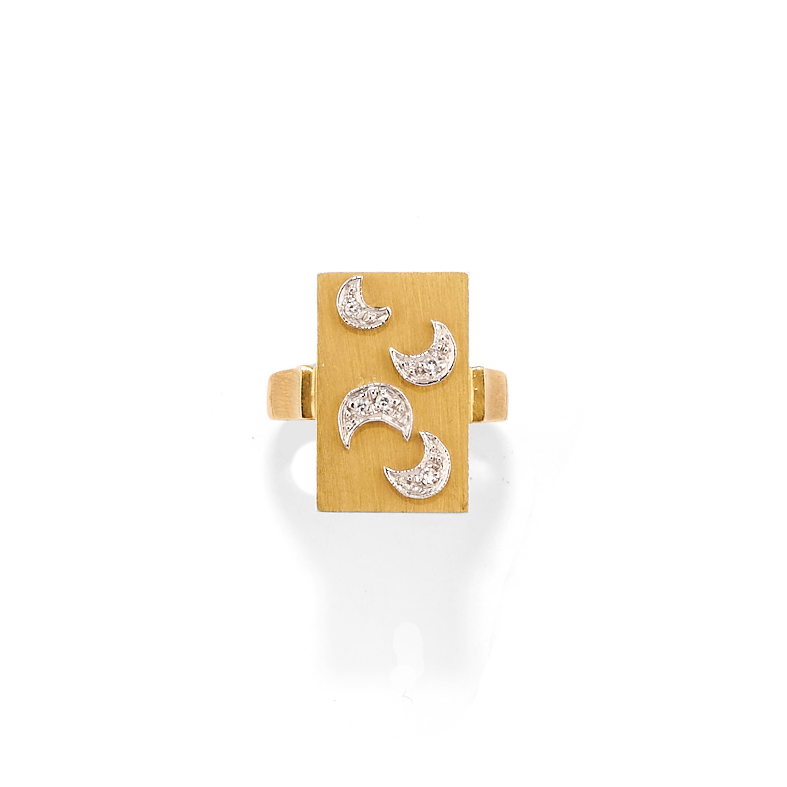 in oro bicolore 18kuno con lune in diamanti taglio huit-huit, uno bombato con piccoli diamanti e uno a contrarié, difetti.
