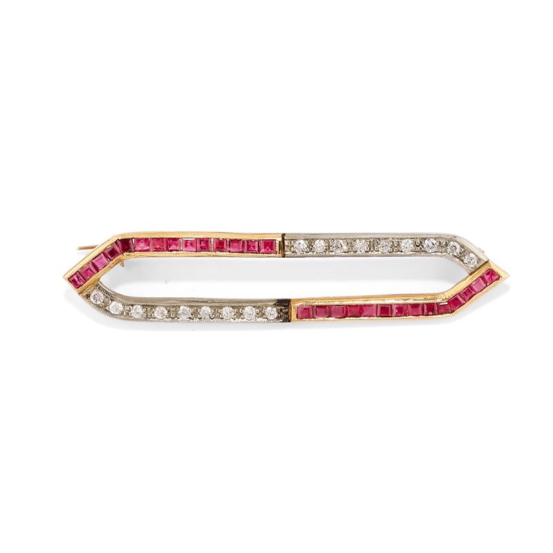 in oro giallo bassa caratura e argentodue decorate con diamanti taglio brillante e rosa e rubini taglio carré, ovale e rotondo, una con smeraldo taglio ovale e diamanti taglio rosa, difetti.