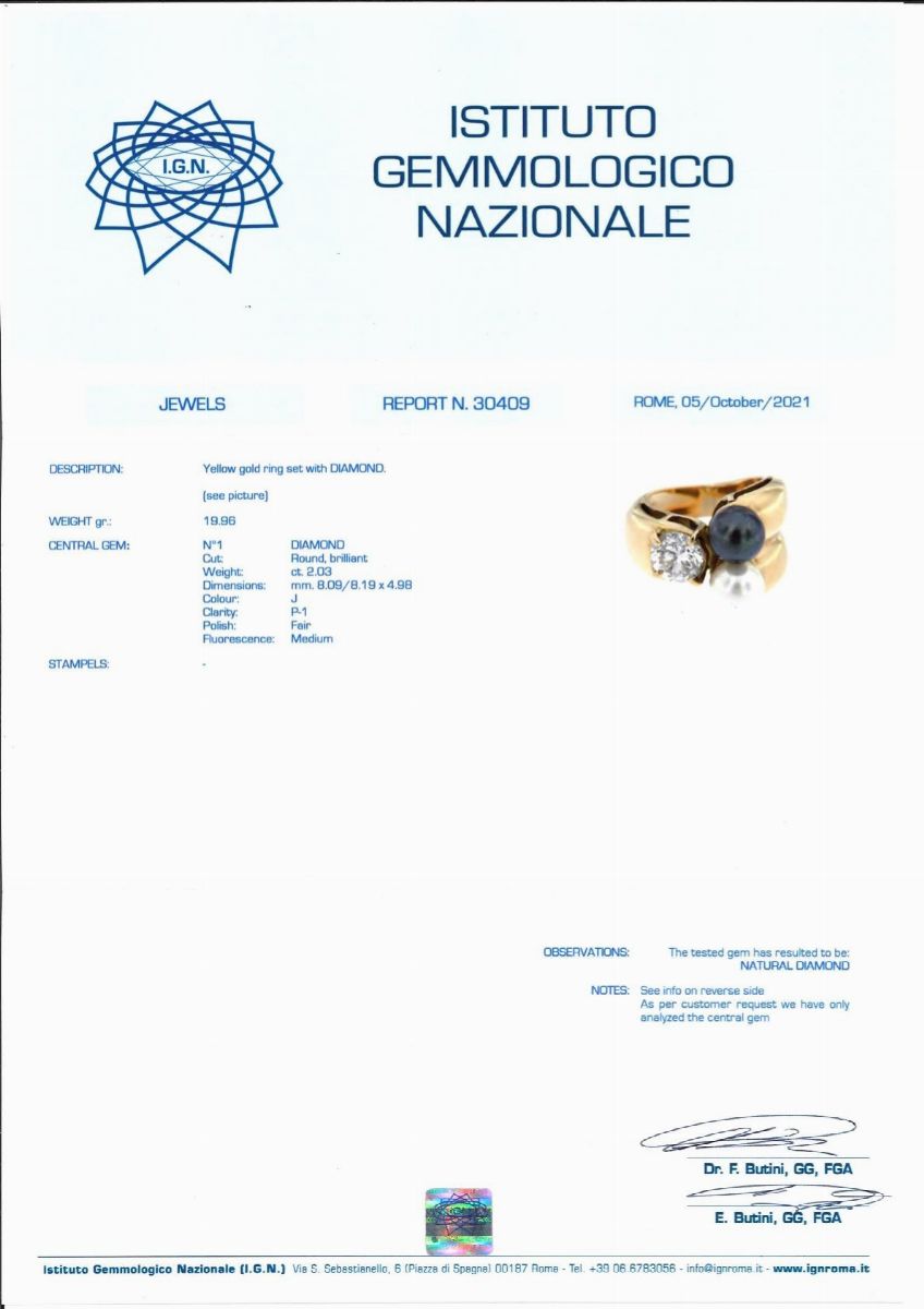 Il diamante è accompagnato da certificato gemmologico n. 30409 del 05/10/2021, I.G.N. Roma