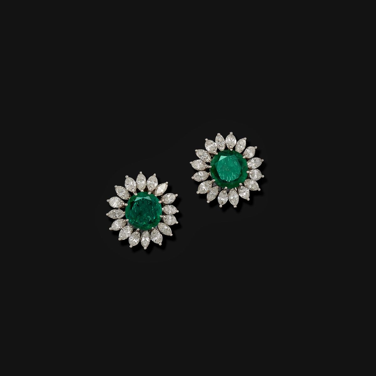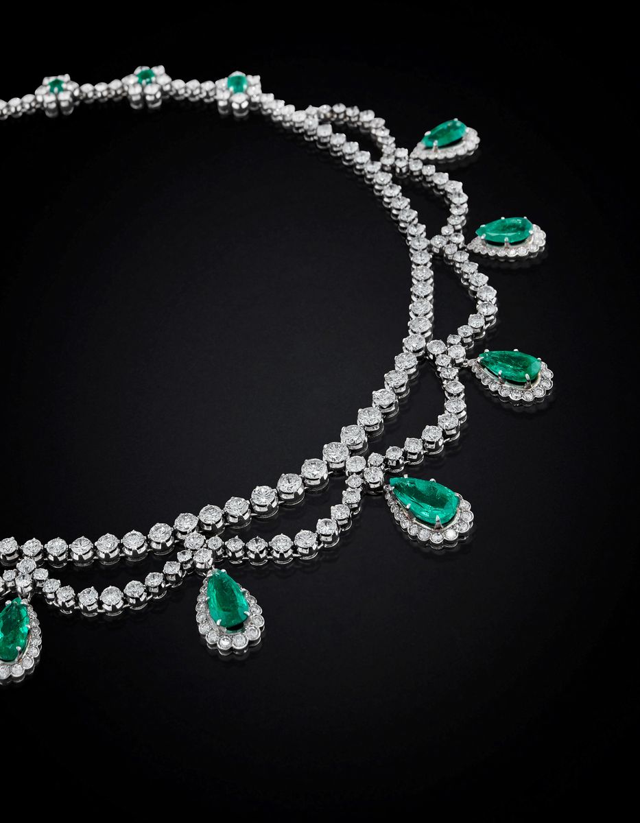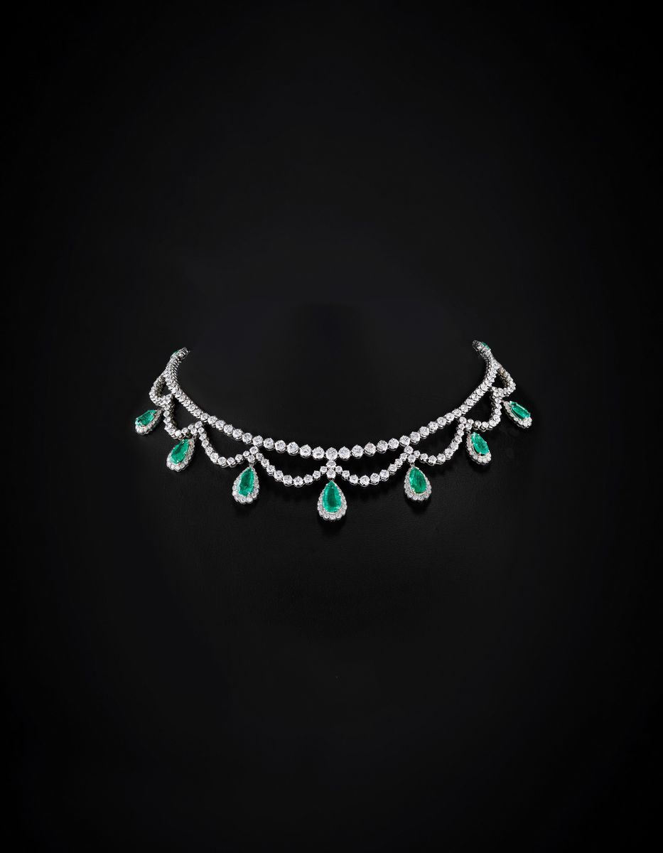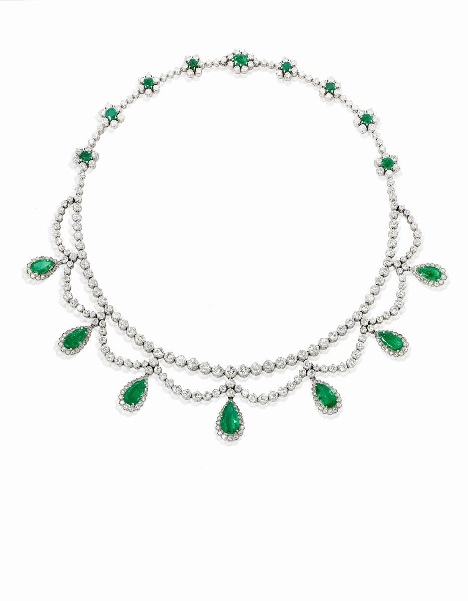 in platino con smeraldi taglio rotondo per totale ct 3,00 circa e diamanti taglio navette per totale ct 2,50 circa, con chiusura a clip, collana in oro bianco 18K con diamanti taglio brillante per totale ct 25,00 circa, elegante decoro a fiori e gocce in smeraldi taglio rotondo, ovale e goccia per totale ct 12,00 circa.Peso g 77,20 orecchini diametro cm 2,00 collana cm 42,00