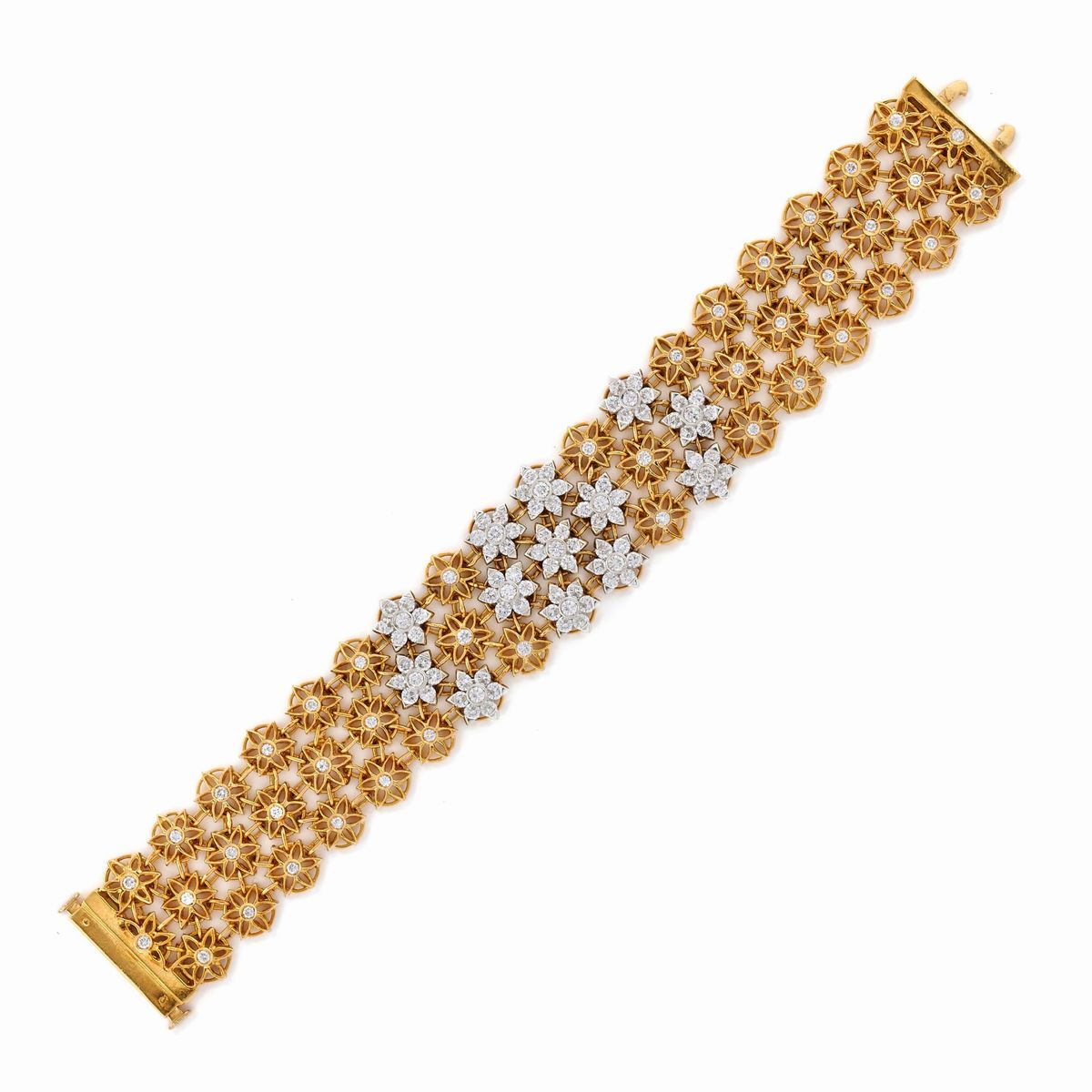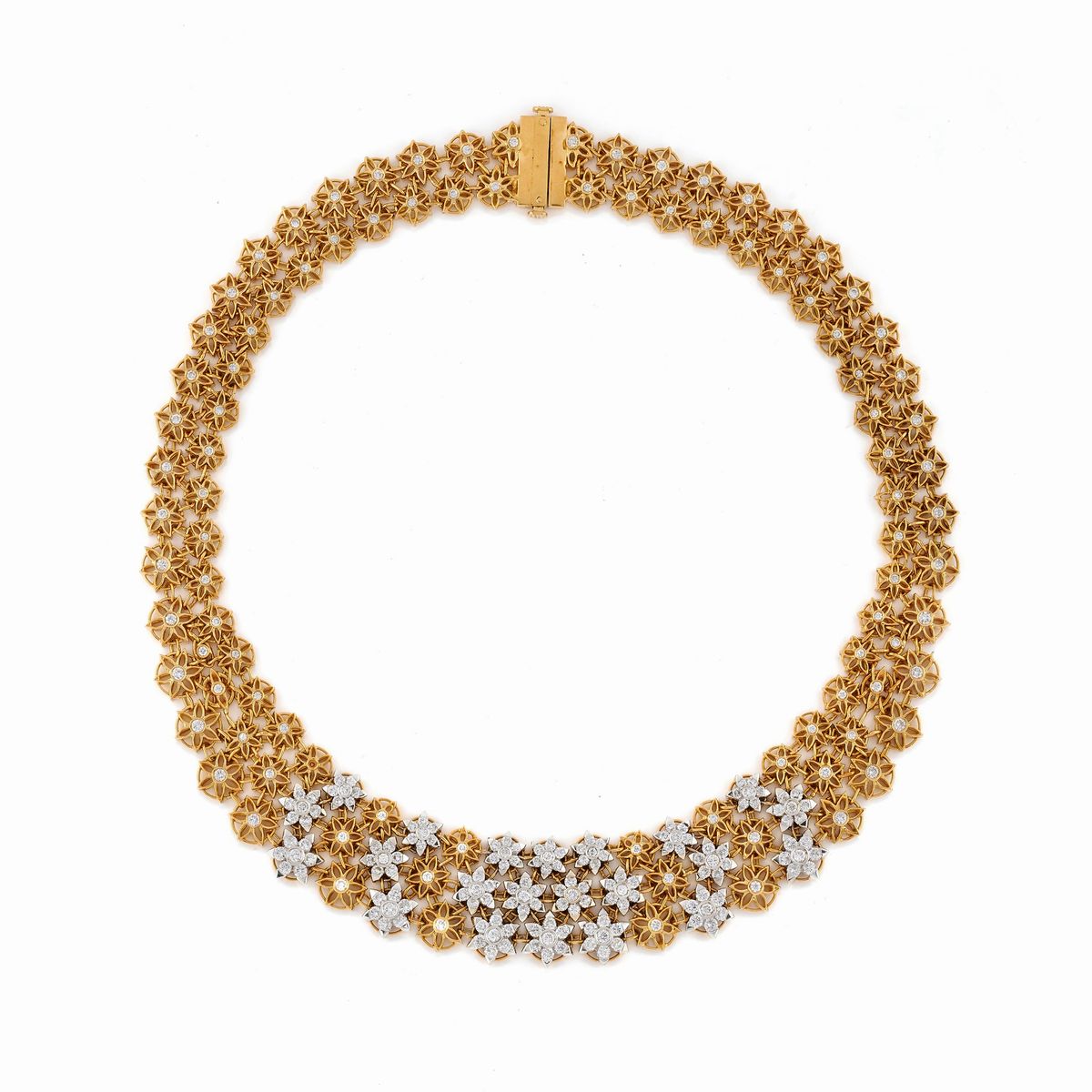 in oro bicolore 18K, composta da bracciale e collana con motivi a fiore in diamanti taglio brillante per totale ct 8,00 circa.