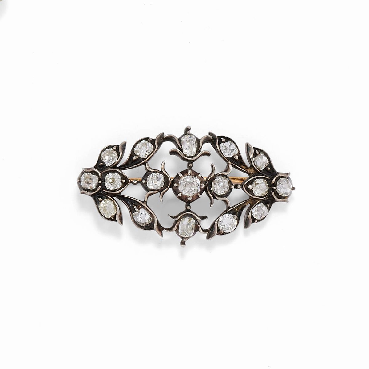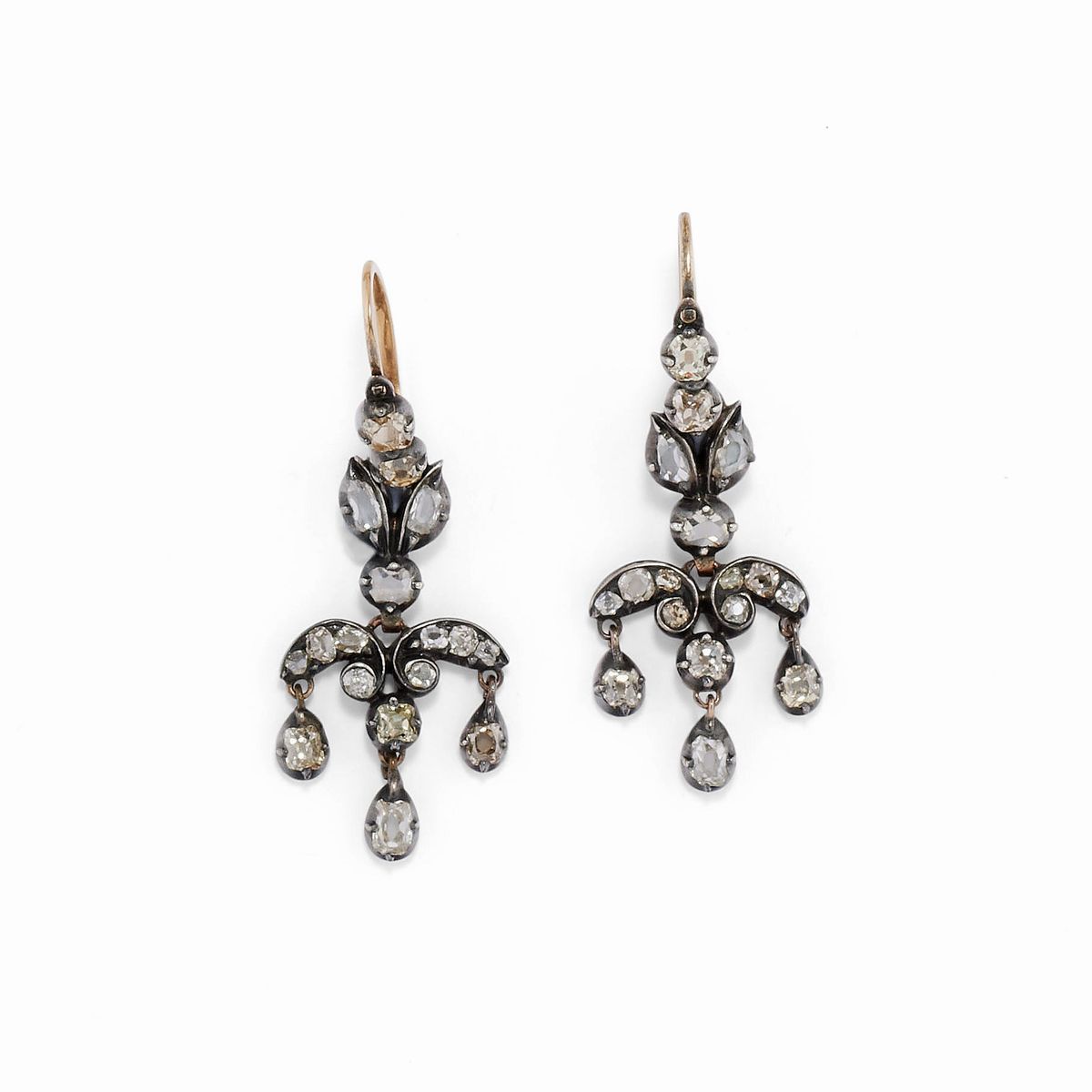 in oro giallo 18K, argento e diamanti taglio Vecchio, composta da spilla e orecchini-pendenti, con chiusura a monachella.
