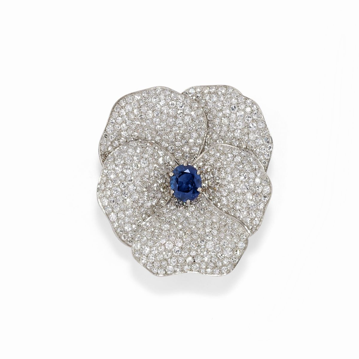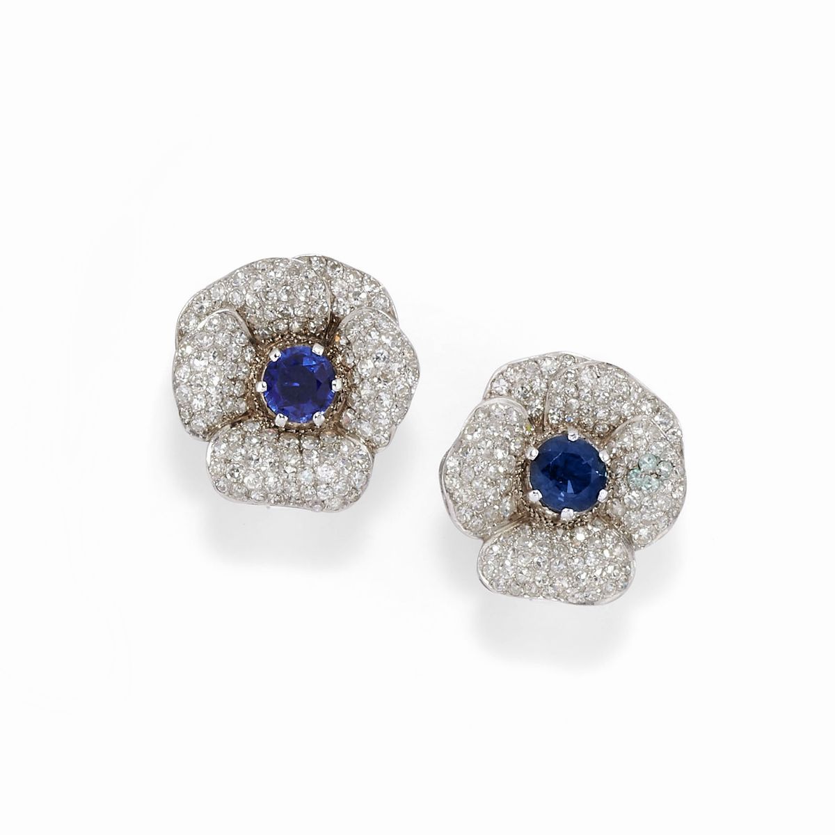 in oro bianco 18K, a forma di fiore, petali in pavè di diamanti taglio hui-huit e al centro zaffiri taglio ovale e rotondo per totale ct 3,50 circa, chiusura con perno e clip, composta da spilla e coppia di orecchini, difetti (un diamante mancante).