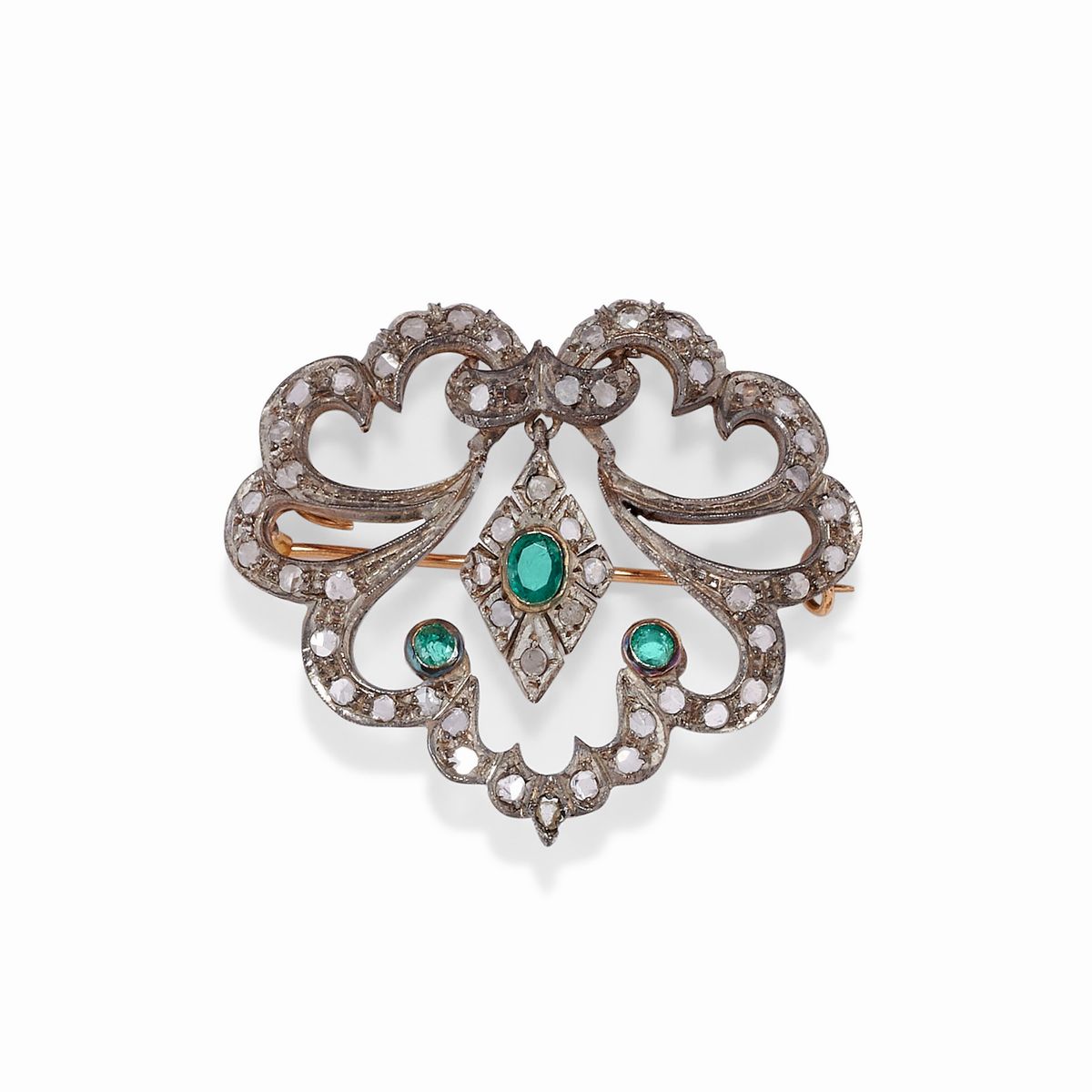 in oro giallo 18K e argento, impreziosite da diamanti taglio rosa, zaffiro, rubino e smeraldi taglio ovale, a motivi basculanti.Peso g 17,80