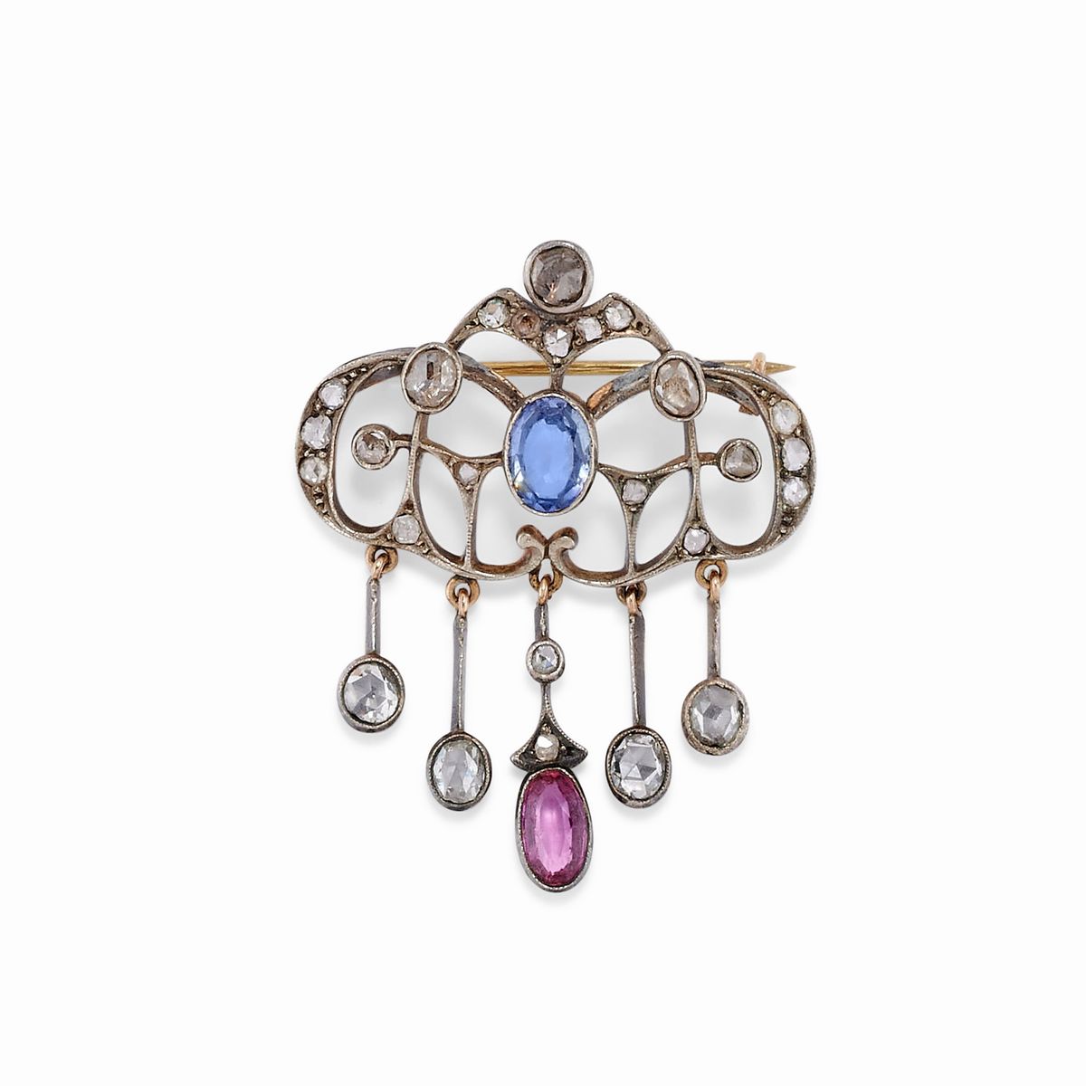 Due spille-pendente con diamanti, smeraldi zaffiro e rubino, inizio XX secolo