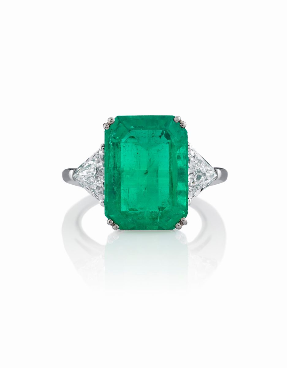 in oro bianco 18K, al centro smeraldo Colombia taglio rettangolare a contorno ottagonale di ct 8,78, ai lati due diamanti taglio triangolo per totale ct 1,42.