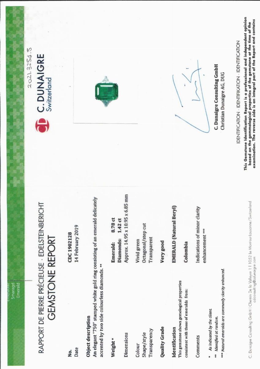 Lo smeraldo, "minor clarity enhancement", è accompagnato da certificato gemmologico n. CDC 1902128 del 14/02/2019,C. Dunaigre