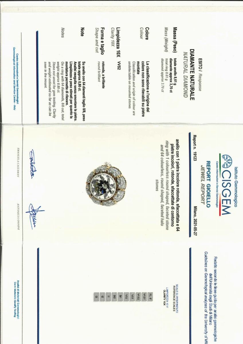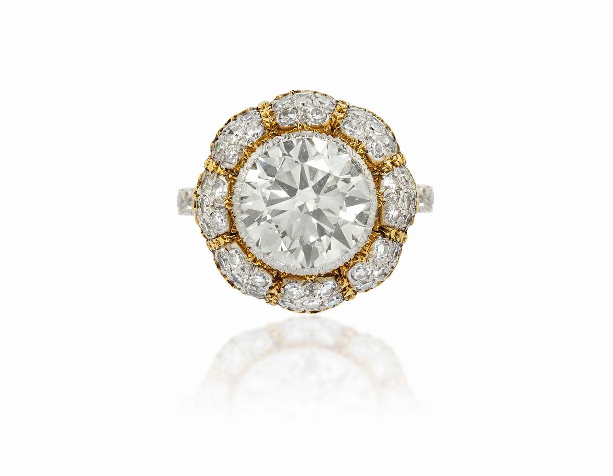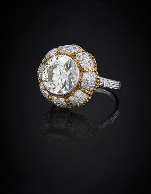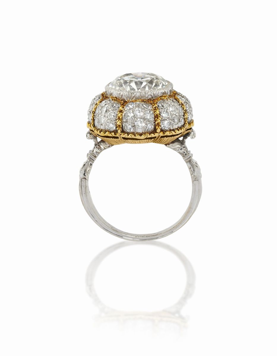 in oro bicolore 18K, al centro diamante taglio brillante di ct 3,70 circa, prob. colore K, purezza VVS2, a bocciolo, impreziosito da sessantaquattro diamanti taglio huit-huit per totale ct 0,80 circa, reca firma Buccellati, punzone 750, incisione M.M.R. 1971.Peso g 8,61 misura 12