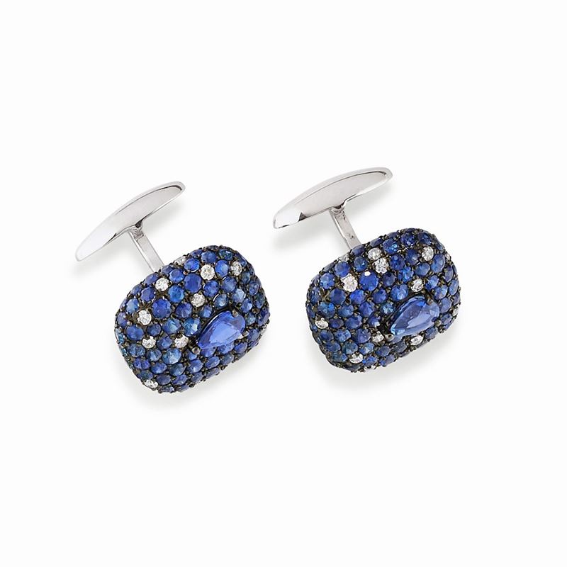in oro bianco e brunito 18K, zaffiri taglio goccia e rotondo per totale ct 6,40 circa, diamanti taglio brillante per totale ct 0,95 circa, a bottone con chiusura a scatto.Peso g 8,60