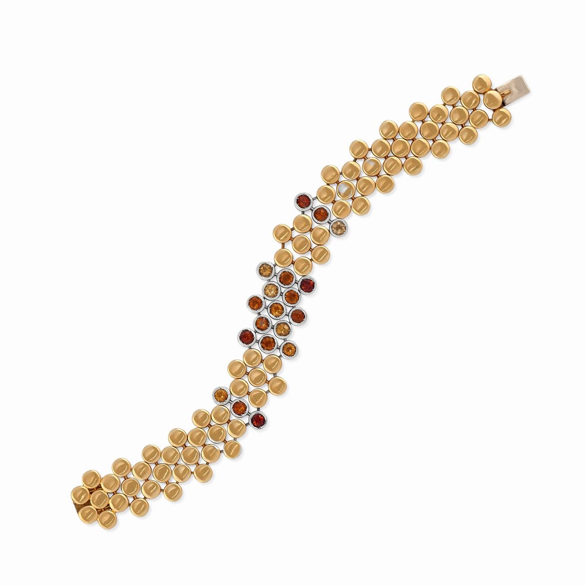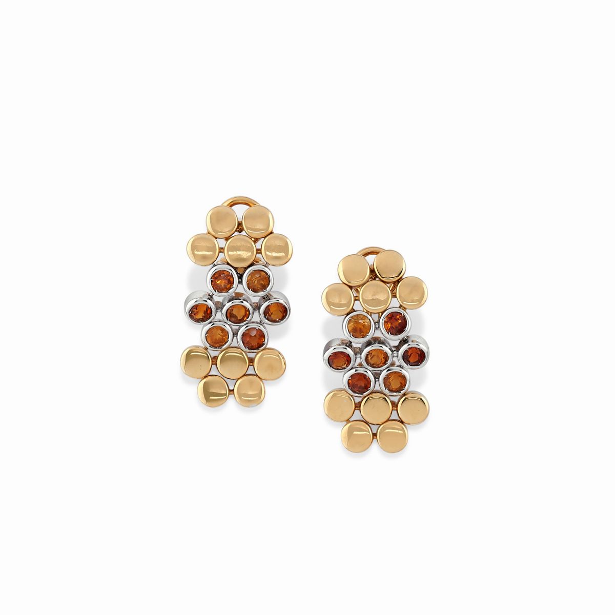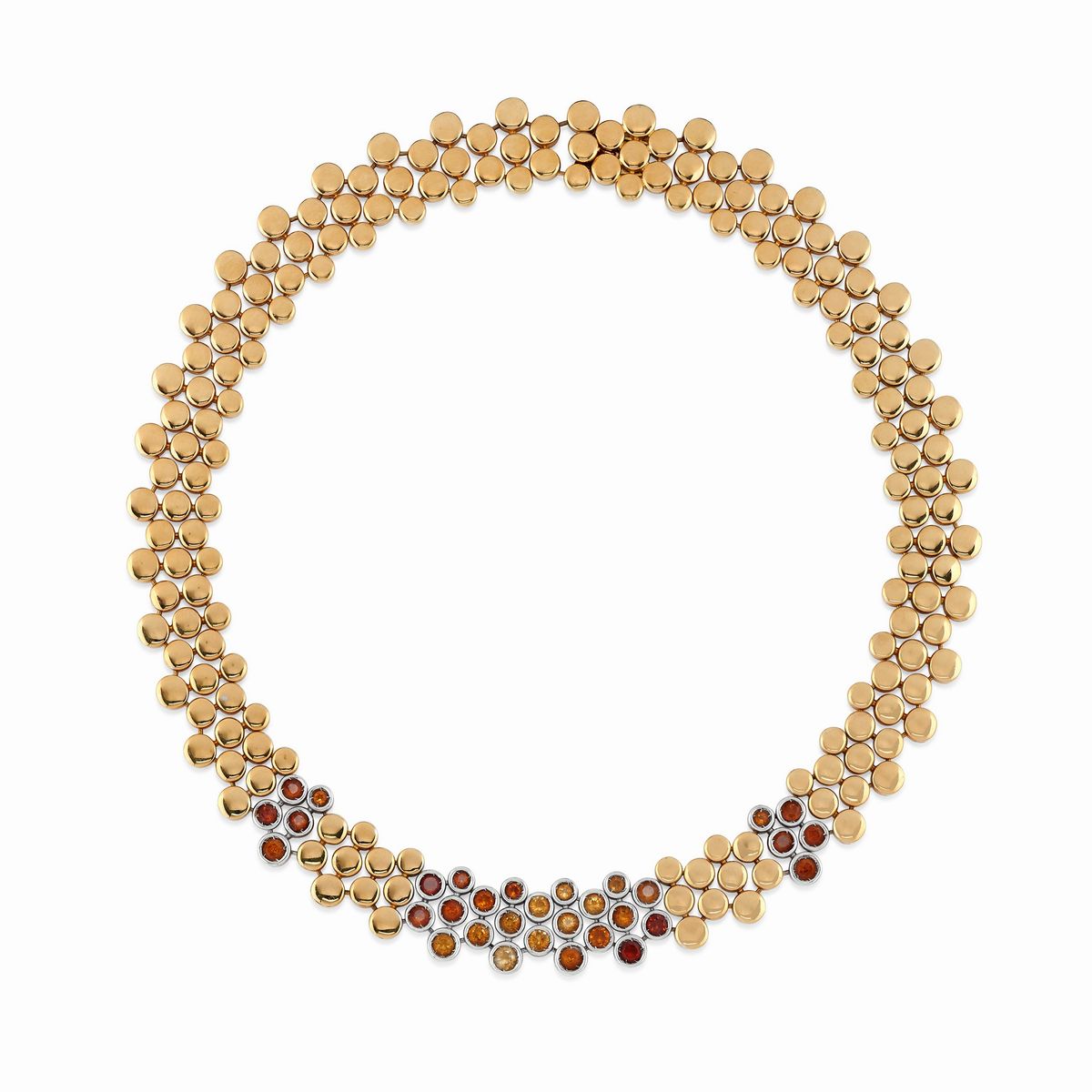 in oro bicolore 18K, a moduli tondi snodati con quarzi citrini taglio rotondo, composta da collana, bracciale e orecchini, chiusura con perno e clip.Peso gr 146,50 collana cm 42,00 bracciale cm 18,00