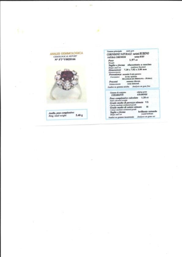 Il rubino che non presenta indicazioni di trattamento termico ed i diamanti sono accompagnati da analisi gemmologica n.FT*Y0020166 Dott. Giulio Provera, Valenza