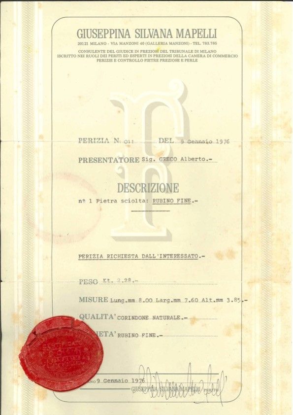 Il rubino è accompagnato da perizia n. 011 del 9/01/1976, Milano