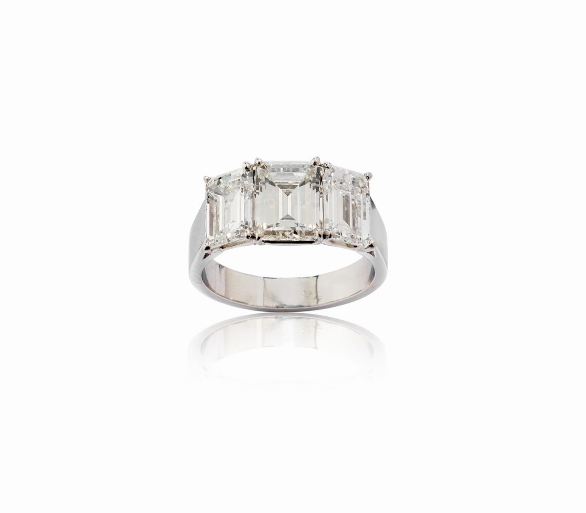 al centro un diamante taglio rettangolare a contorno ottagonale di ct 1,99, colore G, purezza VVS2, ai lati un diamante taglio rettangolare a contorno ottagonale di ct 1,27, colore E, purezza VVS1 e un diamante taglio rettangolare a contorno ottagonale di ct 1,30, colore E, purezza VVS1.