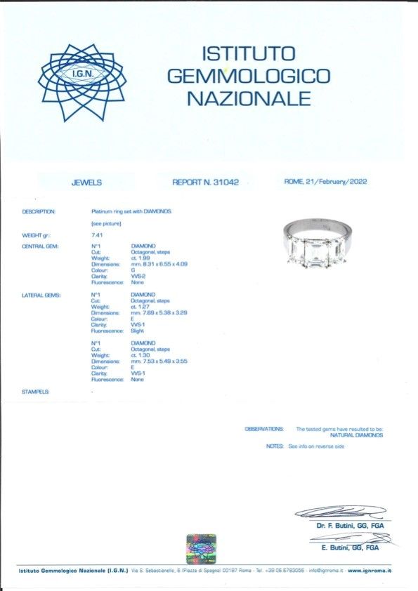 L'anello è accompagnato da certificato gemmologico n. 31042 del 21/02/2022, I.G.N. Roma.