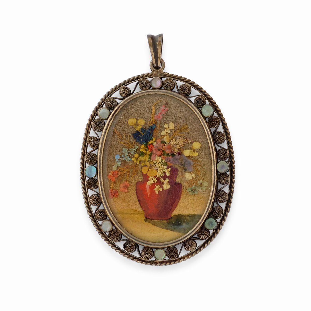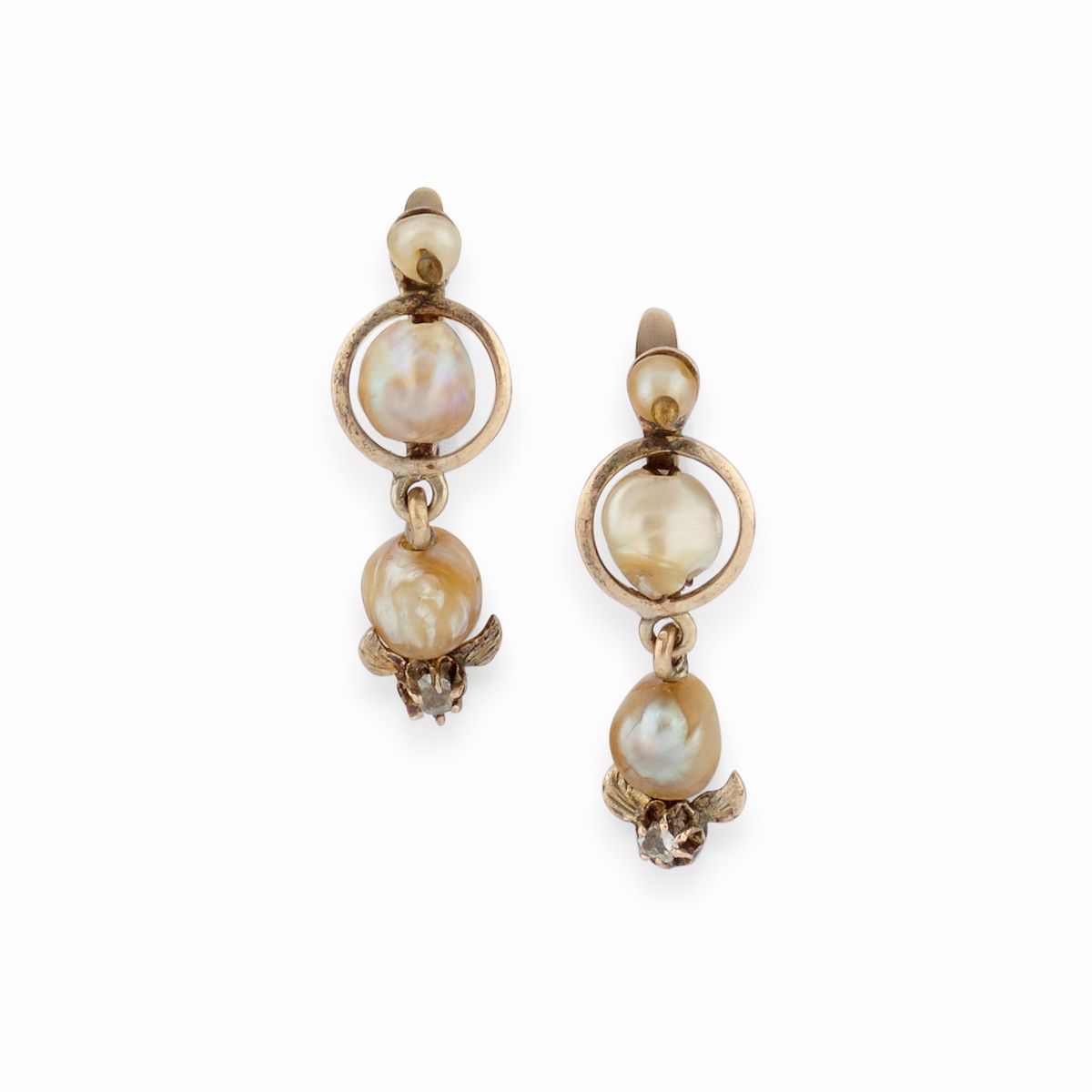 orecchini con chiusura a monachella, pendenti con raffigurazioni floreali.