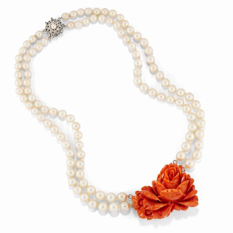 Due pendenti in oro giallo 18k, perla coltivata, rubini e diamanti