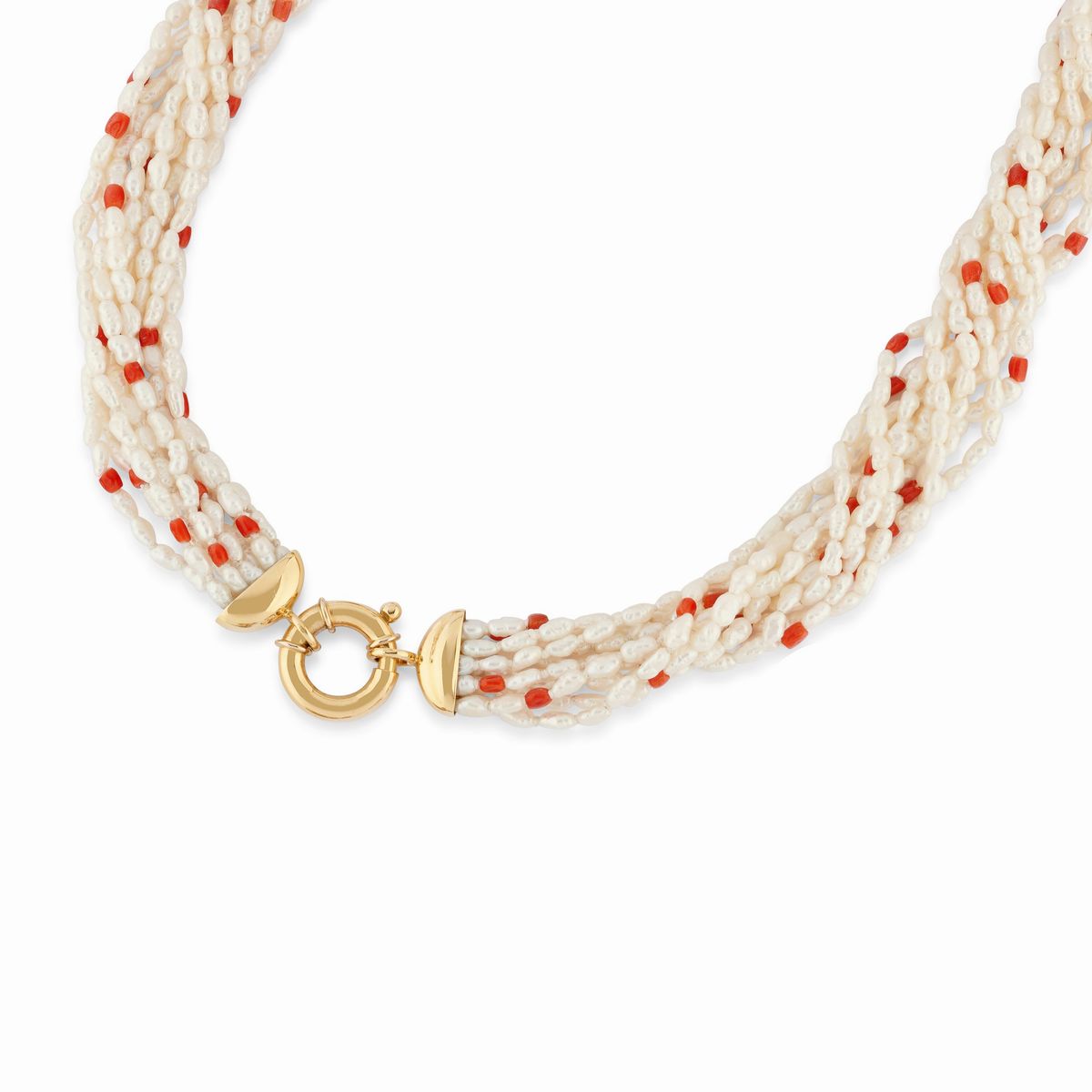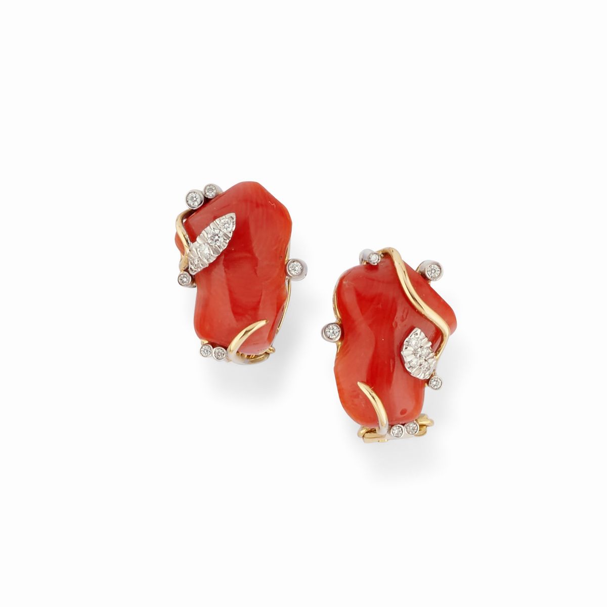 collana a torchon di perle di acqua dolce intervallate da coralli, con fermezza a moschettone e orecchini con corallo e motivi in diamanti taglio brillante, chiusura perno e clip.