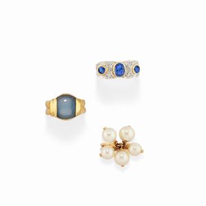 Tre anelli in oro giallo 18K, zaffiri, diamanti, perle e calcedonio