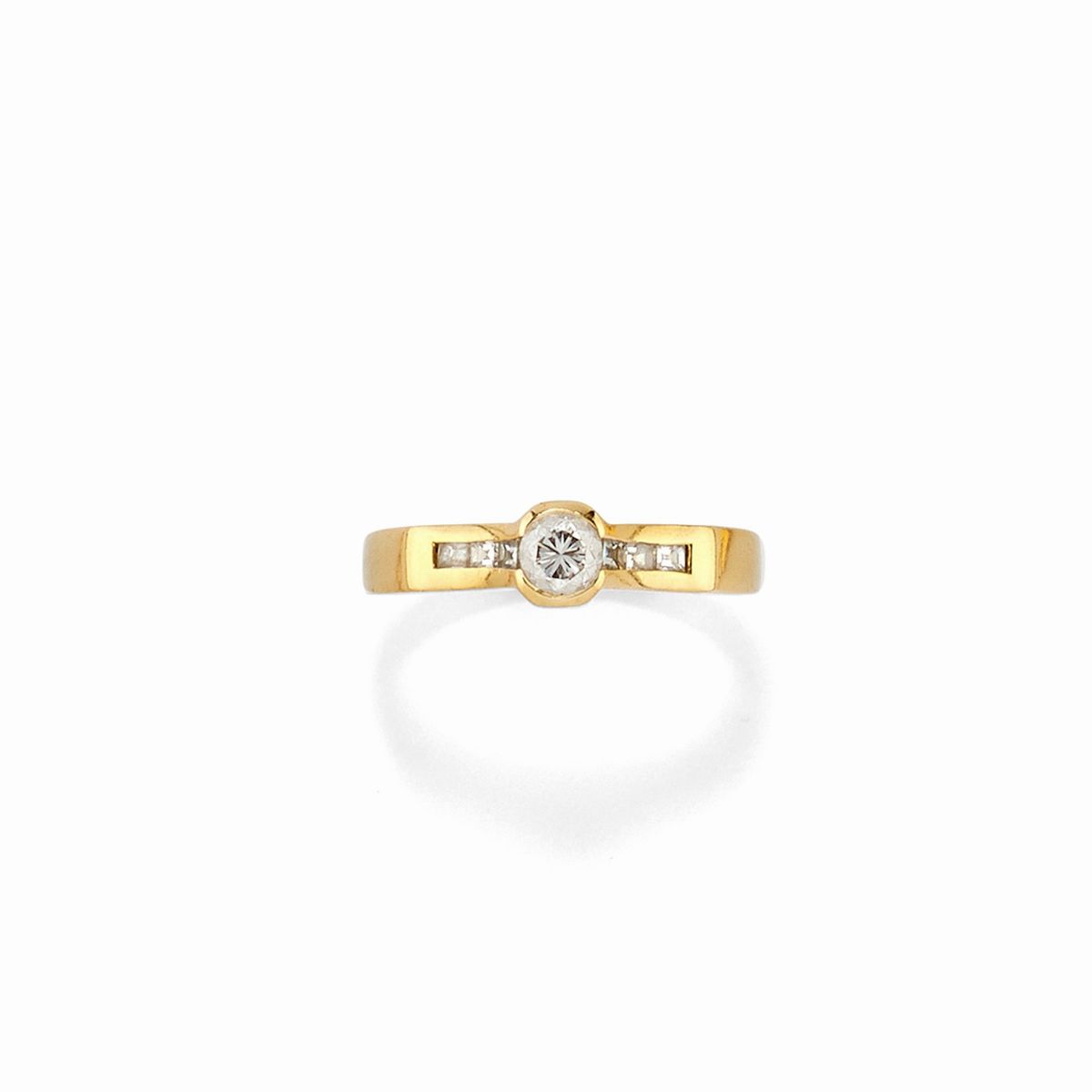 collana a catena con maglie ovali, orecchini pendenti con perno e farfalla ed anello solitario con diamante taglio brillante e carré sul gambo per totale ct 0,45 circa.