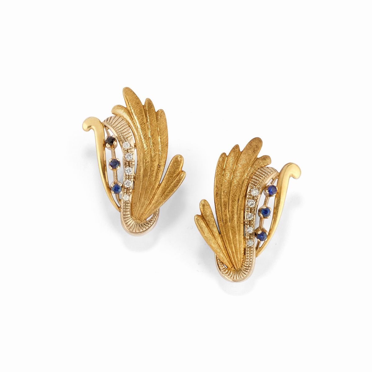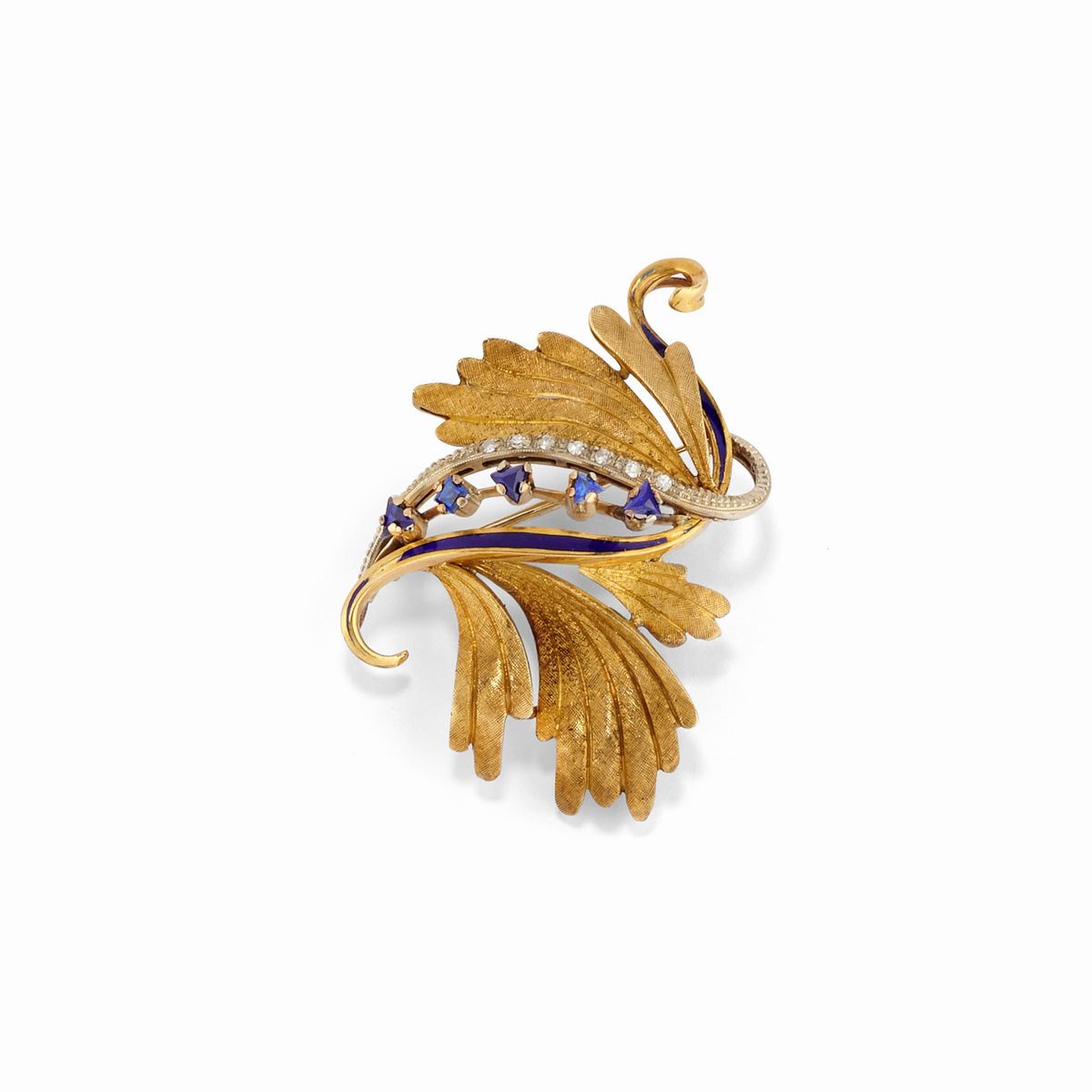 composta da spilla e orecchini a clip, a motivo fogliaceo con diamanti taglio huit-huit e zaffiri taglio rotondo e triangolare e smalto blu.