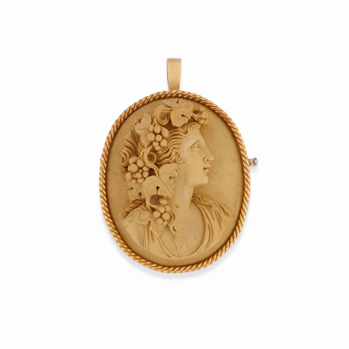 composta da bracciale, pendente-spilla e anello con cammei in pietra dura raffiguranti profili femminili scolpiti ad alto rilievo.