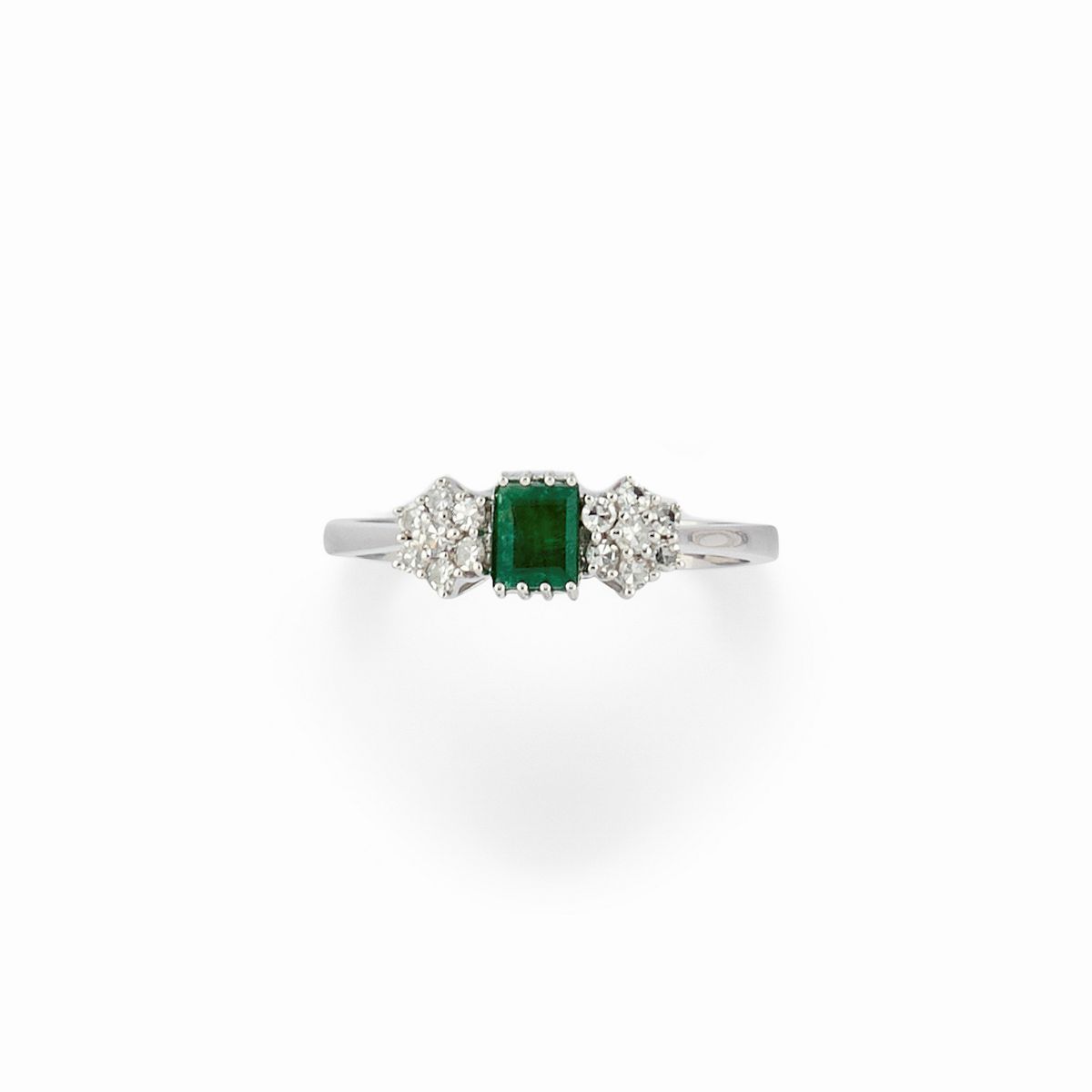 uno a contorno con smeraldo centrale ct 0,40 circa taglio rotondo e diamanti taglio brillante totale ct 0,30 circa ed uno con smeraldo di forma rettangolare di ct 0,30 circa e due motivi laterali a fiore per totale ct 0,25 circa.