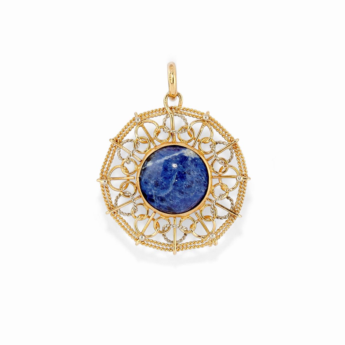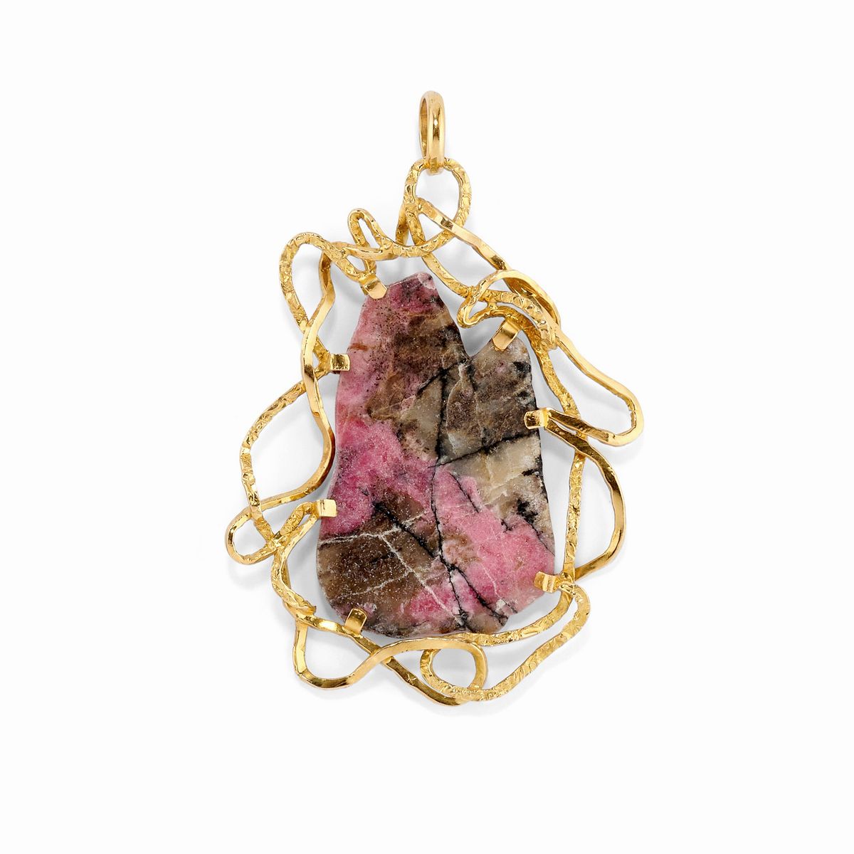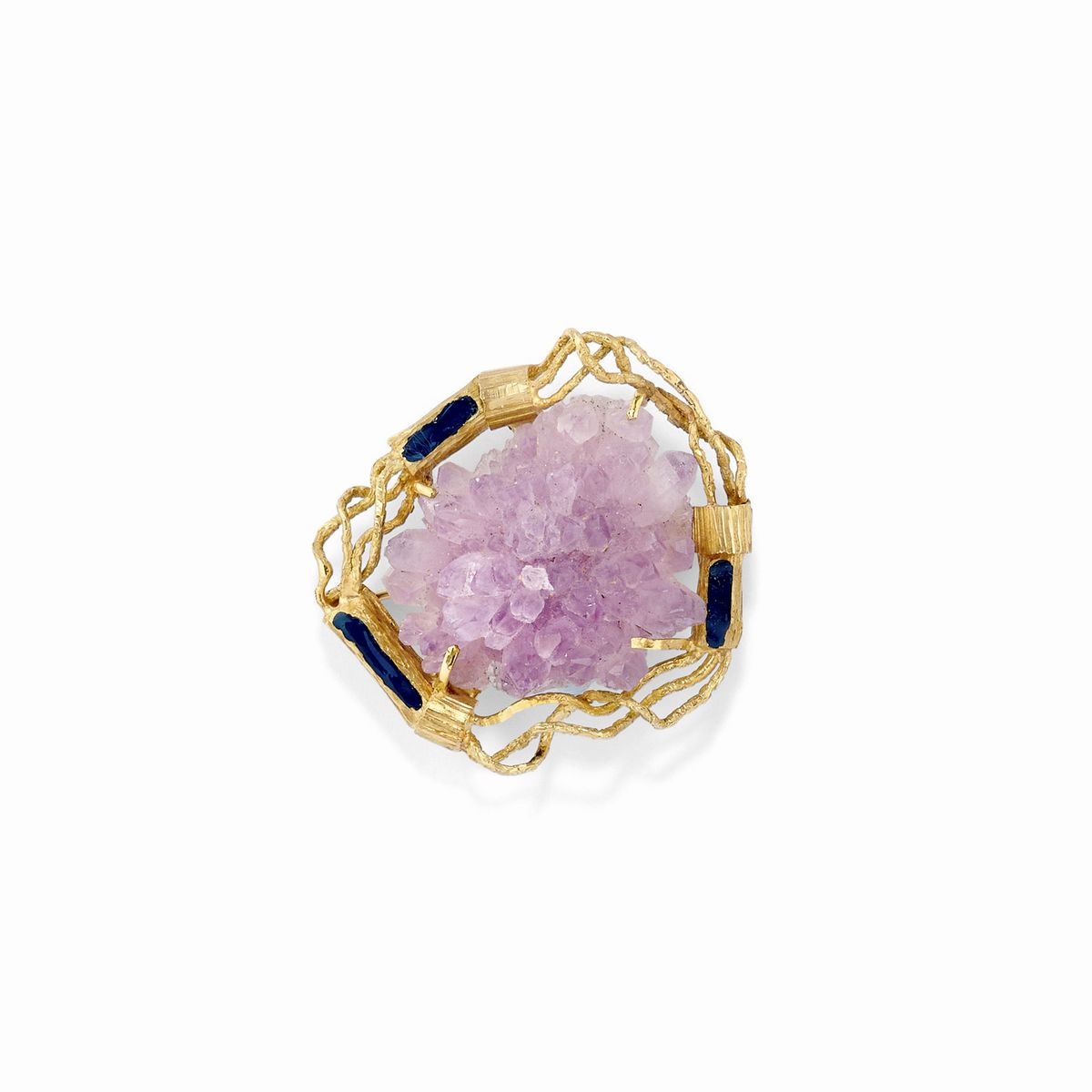 Due pendenti e una spilla in oro giallo 18K, pietre dure e minerale di ametista grezza