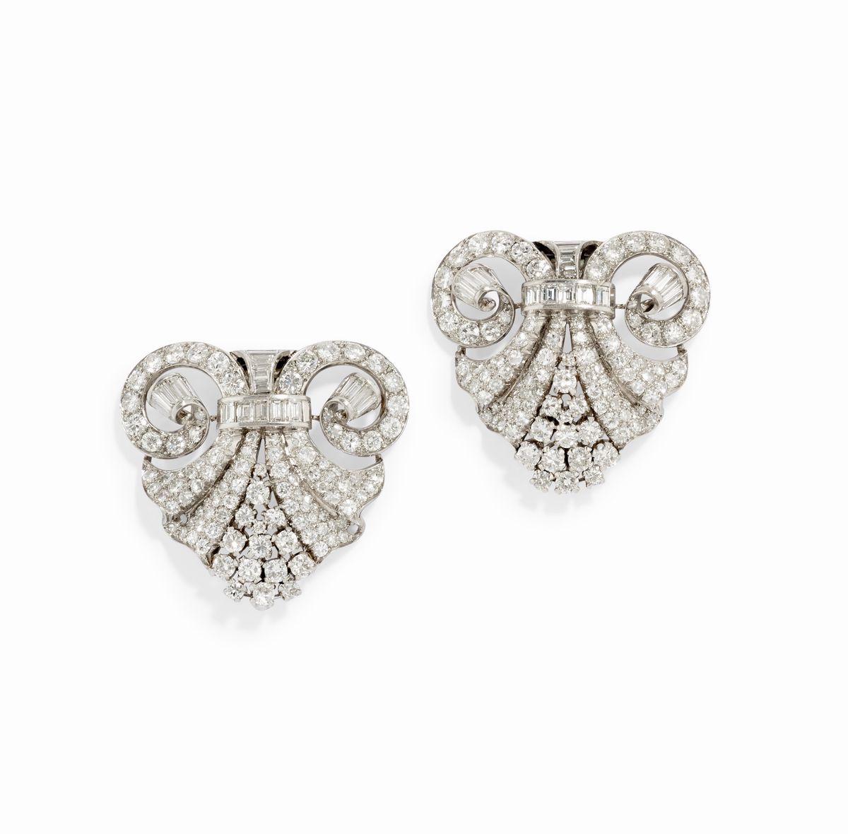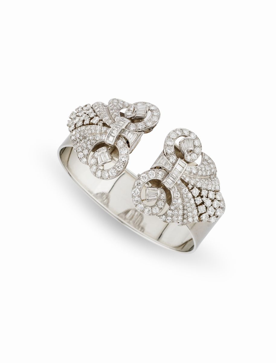 parte centrale circolare con laterali a fiocco nastrato, diamanti taglio vecchio, huit-huit e baguette per totale ct 13,00 circa; componibile in bracciale, doppia clip, spilla singola e spilla a due clip, punzoni del fascio (difetti, mancanza di un piccolo diamante).