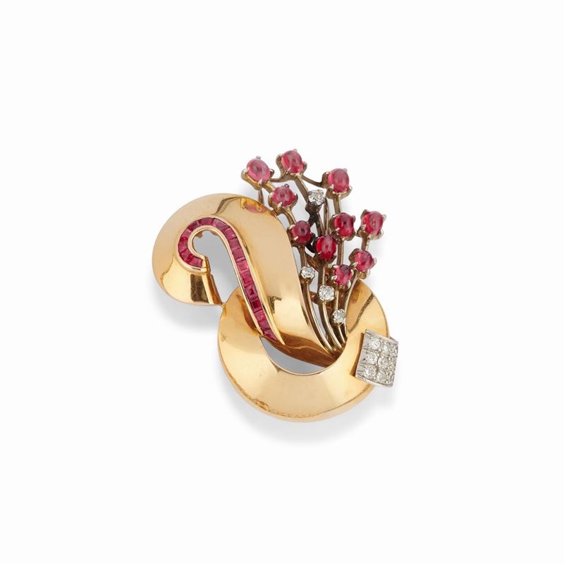 Spilla in oro bicolore 18K, rubini e diamanti, 1940 circa