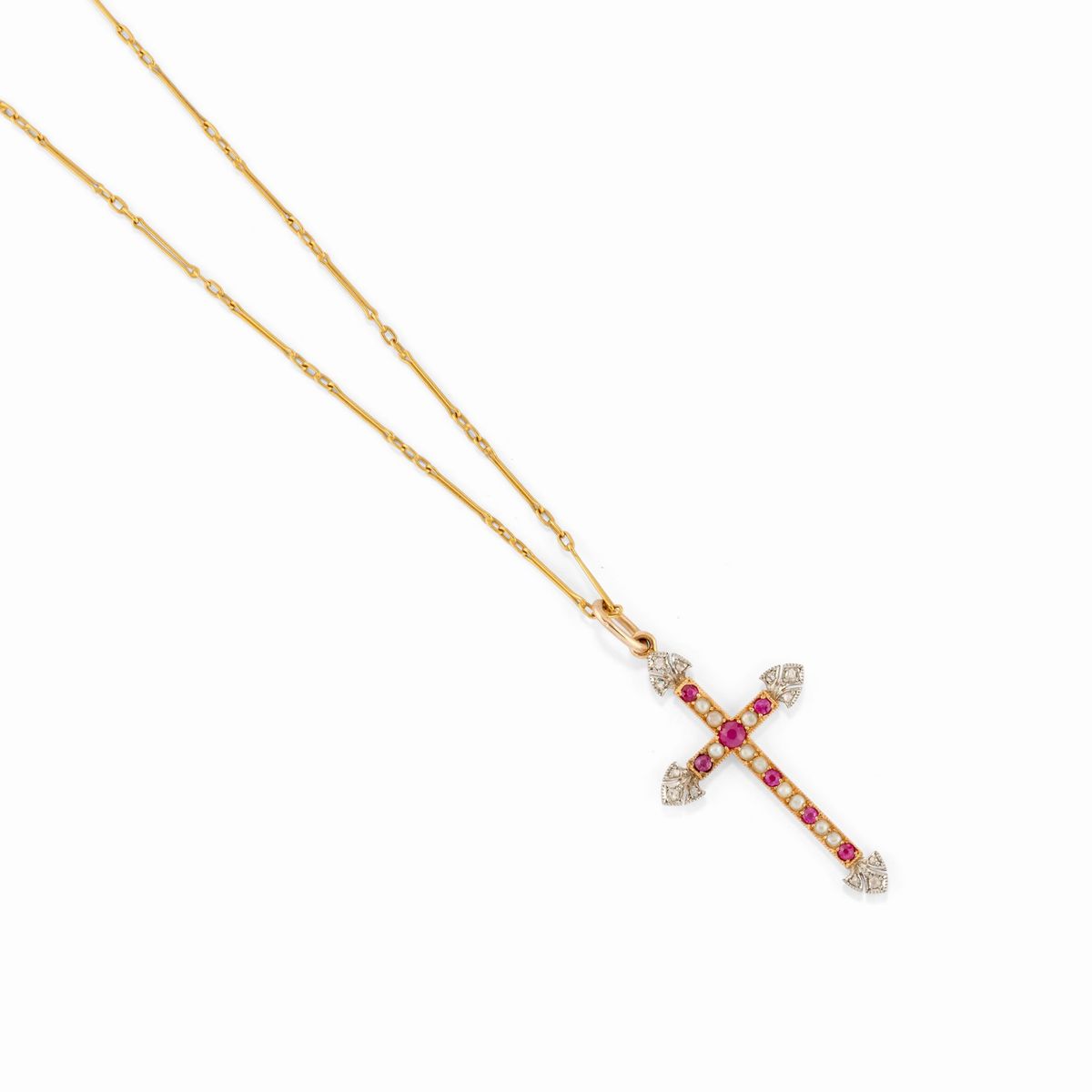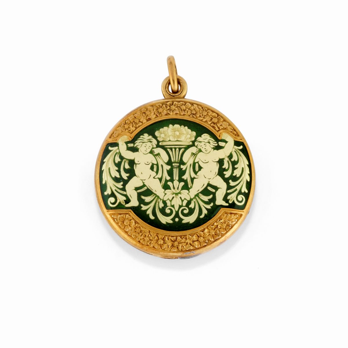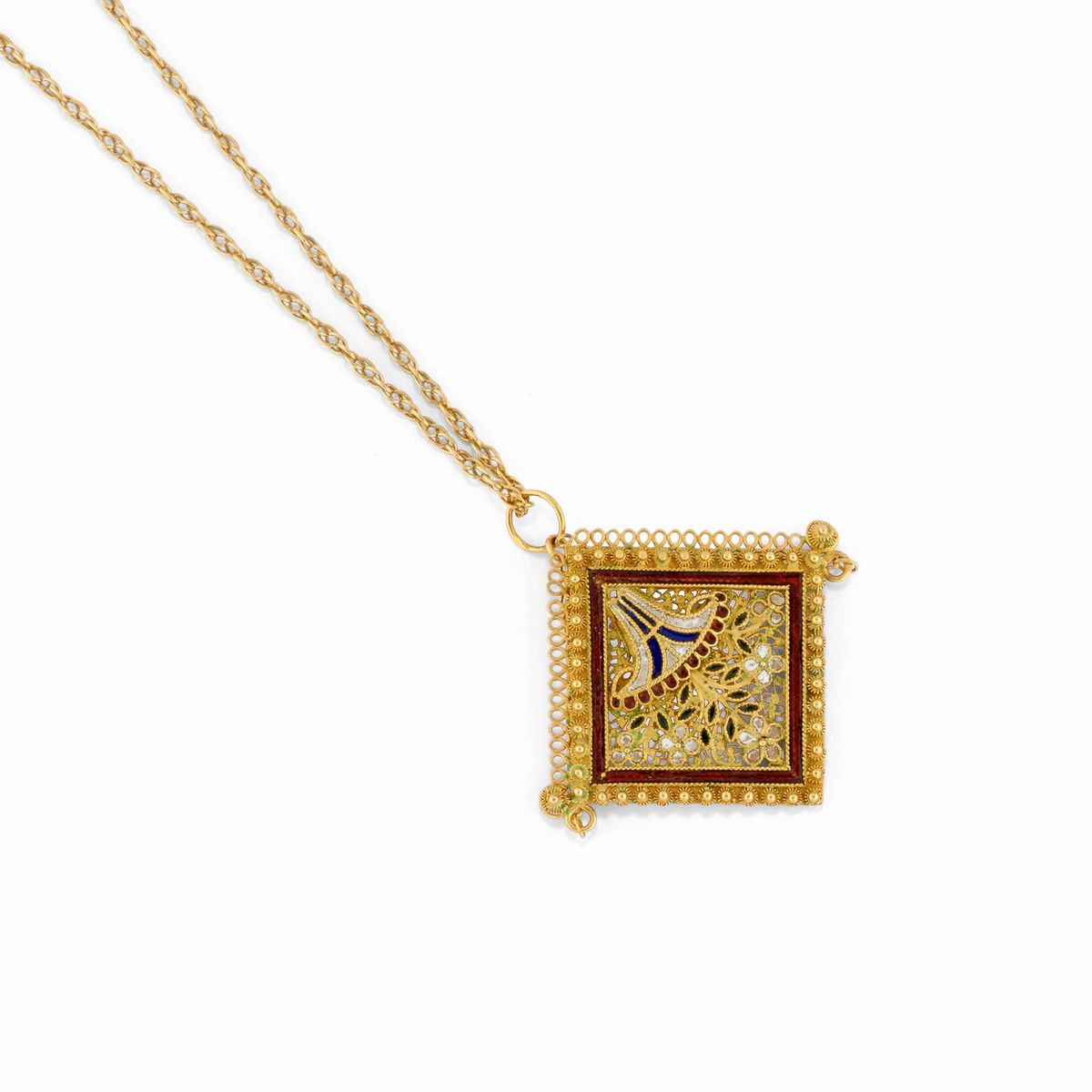 tre collane con catena e pendente di varie forme decorati con smalti, pietra blu, diamanti taglio rosa, rubini e perle, pendente apribile porta fotografia decorato con putti.