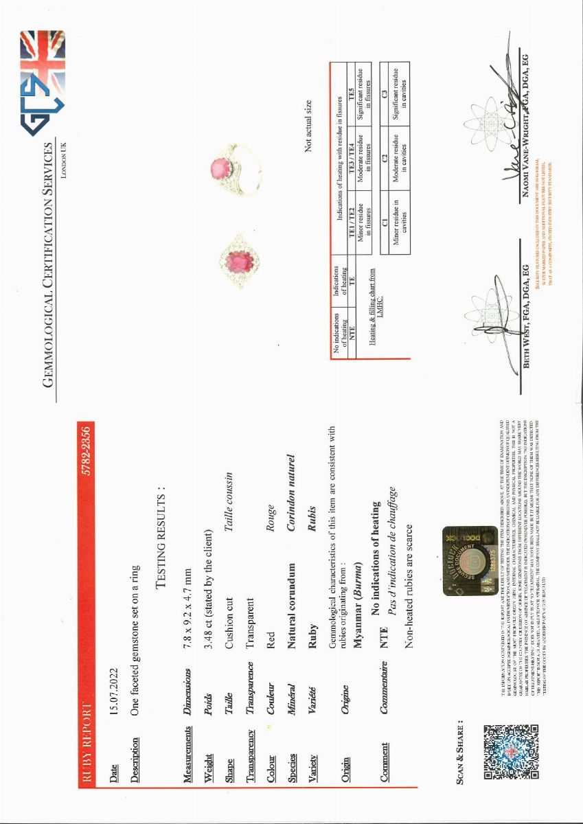 Il rubino che non presenta indicazioni di trattamento termico è accompagnato da certificato gemmologico numero 5782-2356 del 15.07.2022. GCS London